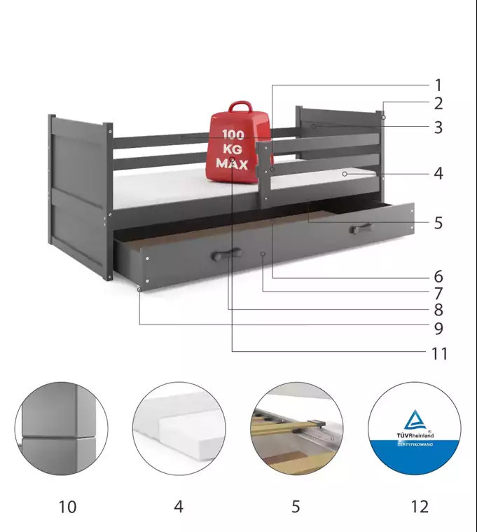 - Certyfikowane łóżko - jakość i bezpieczeństwo zgodnie z normami TUV.