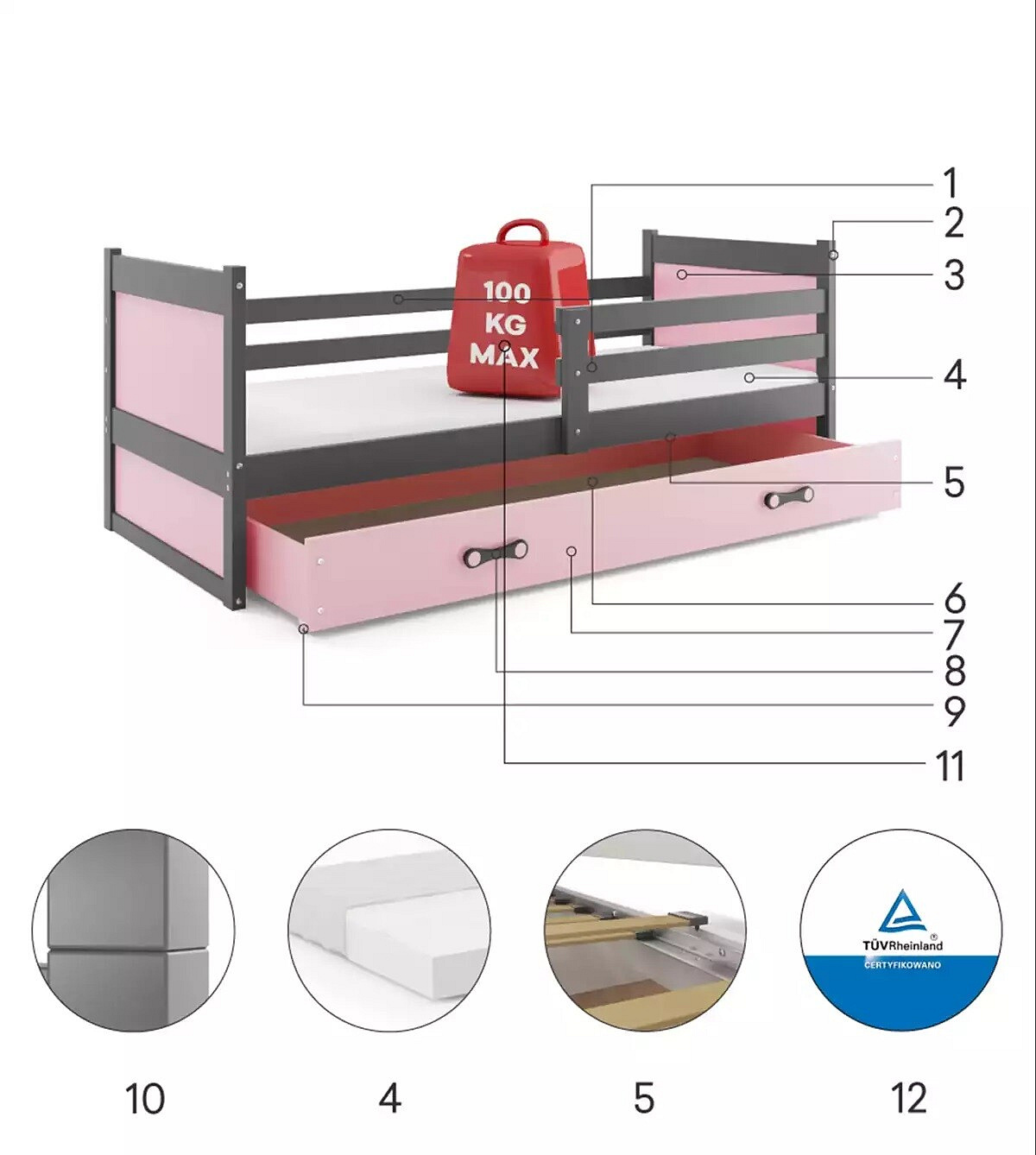 - Certyfikowane łóżko - jakość i bezpieczeństwo zgodnie z normami TUV.