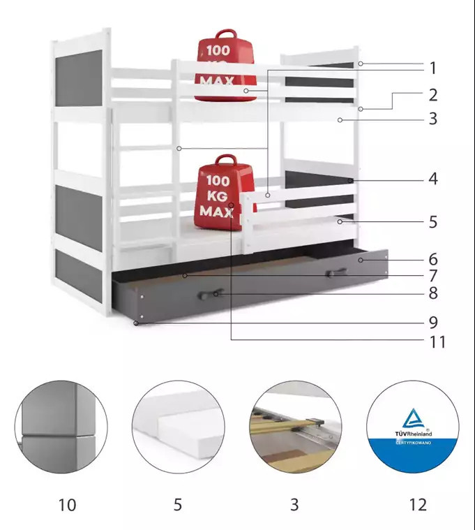 RICO PIĘTROWE RAMA BIAŁY WYPEŁNIENIA GRAFIT SZUFLADA GRAFIT 90 X 200 KPL