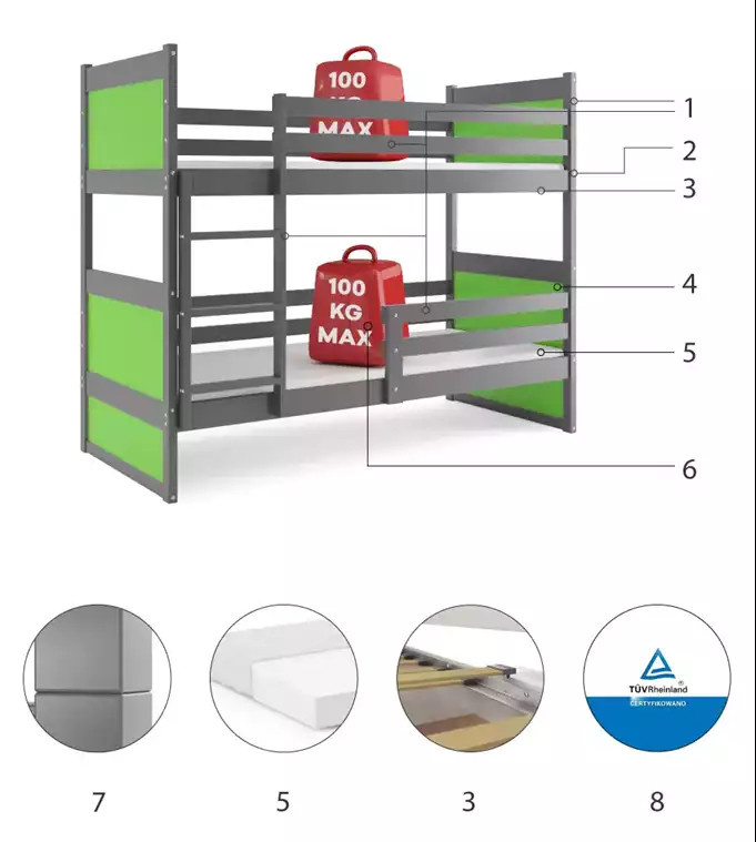 RICO PIĘTROWE RAMA GRAFIT WYPEŁNIENIA ZIELONY BEZ SZUFLADY 90 X 200 KPL