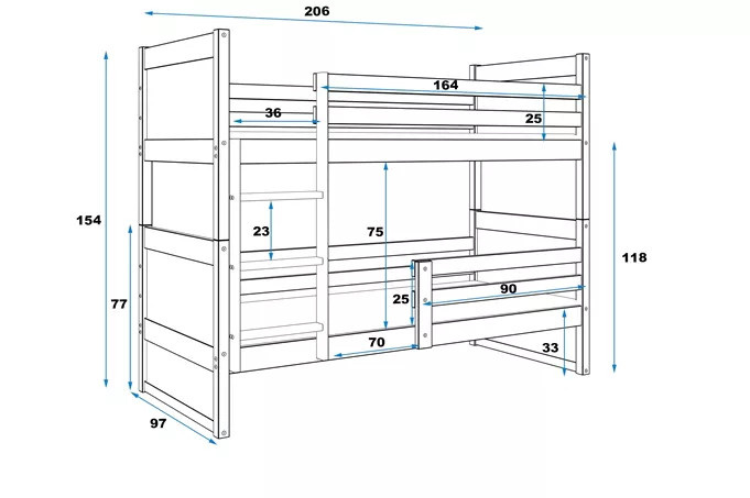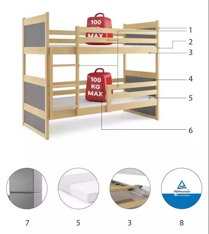 RICO PIĘTROWE RAMA SOSNA WYPEŁNIENIA GRAFIT BEZ SZUFLADY BEZ MATERACY 90 X 200 KPL