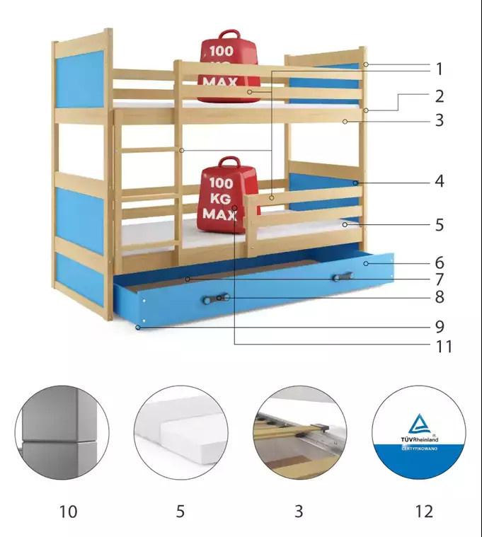 RICO PIĘTROWE RAMA SOSNA WYPEŁNIENIA NIEBIESKI SZUFLADA NIEBIESKI BEZ MATERACY 90 X 200 KPL