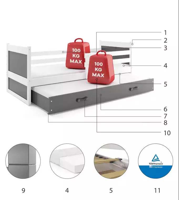 - Certyfikowane łóżko - jakość i bezpieczeństwo zgodnie z normami TUV.