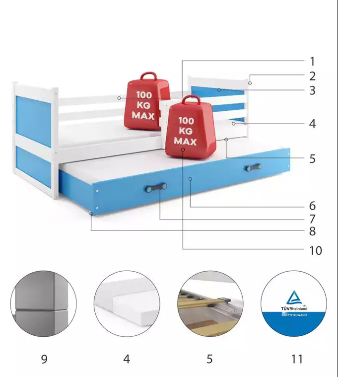 - Certyfikowane łóżko - jakość i bezpieczeństwo zgodnie z normami TUV.