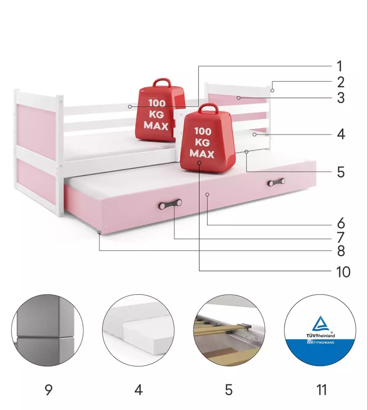 - Certyfikowane łóżko - jakość i bezpieczeństwo zgodnie z normami TUV.