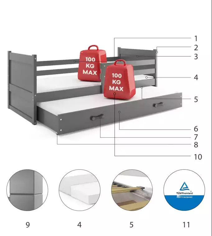 - Certyfikowane łóżko - jakość i bezpieczeństwo zgodnie z normami TUV.