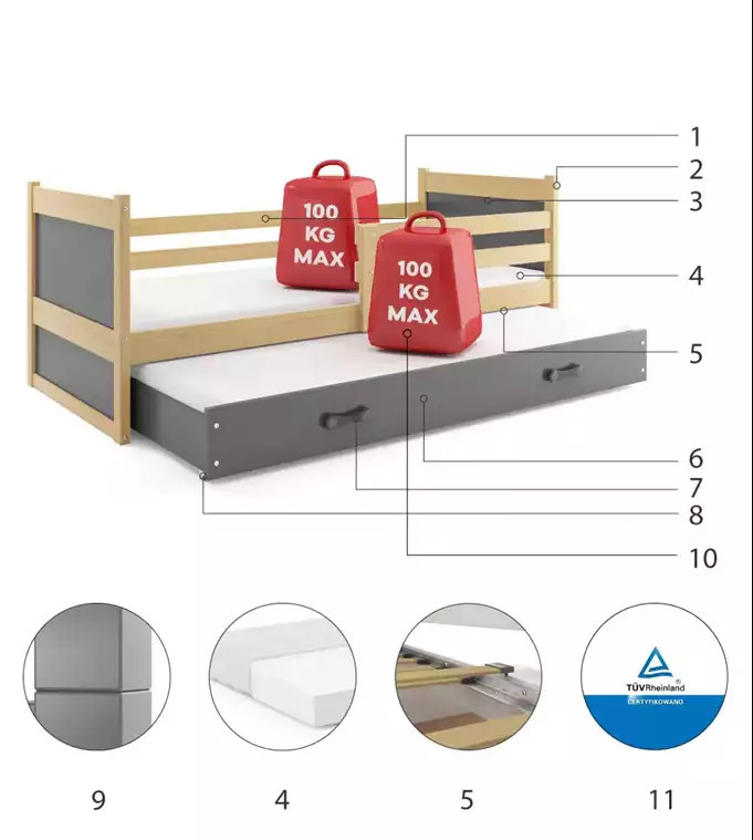 - Certyfikowane łóżko - jakość i bezpieczeństwo zgodnie z normami TUV.