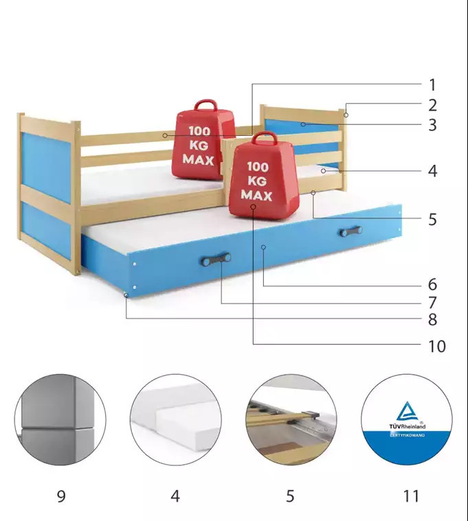 - Certyfikowane łóżko - jakość i bezpieczeństwo zgodnie z normami TUV.