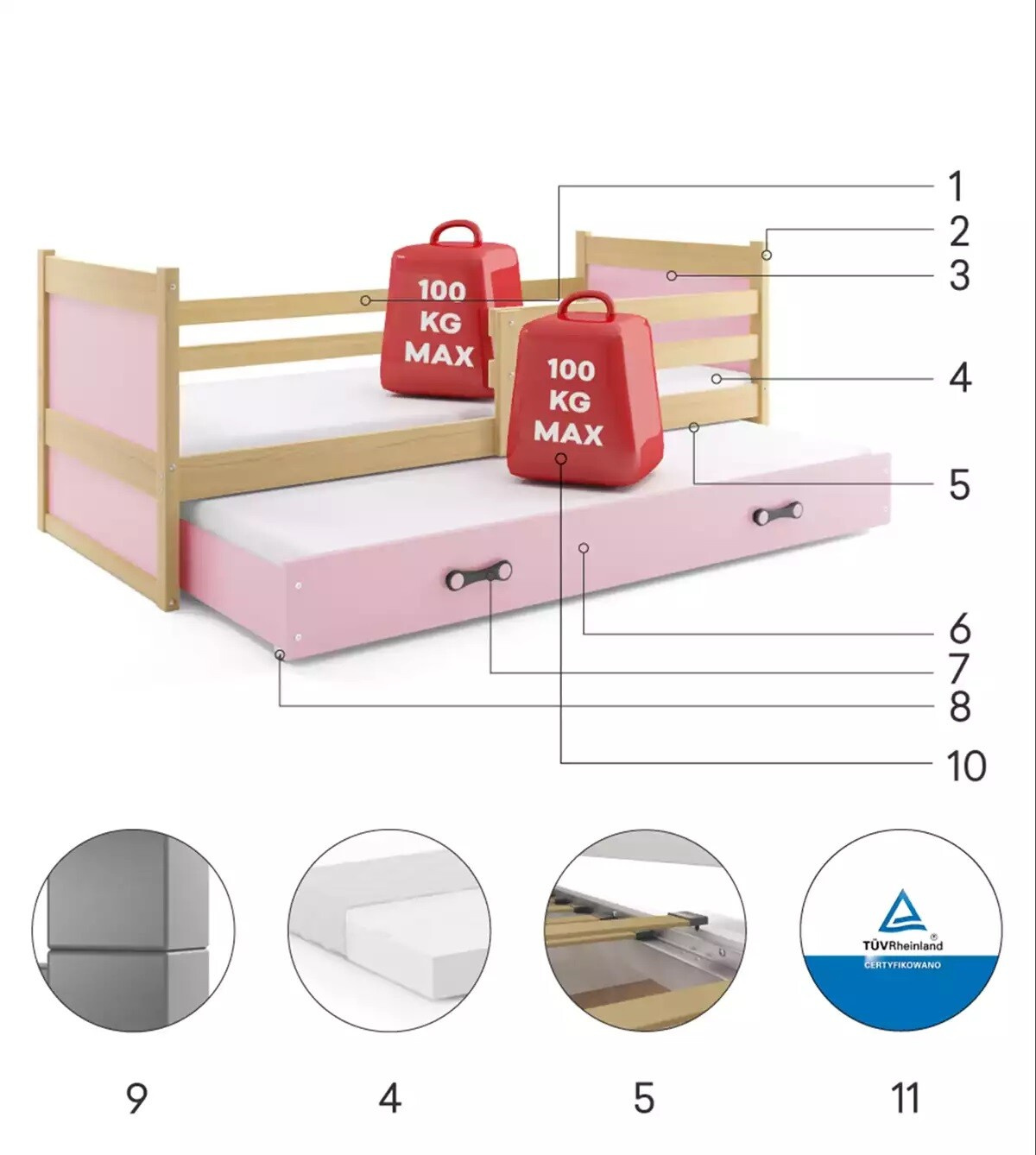 RICO PODWÓJNE RAMA SOSNA WYPEŁNIENIA RÓŻOWY SZUFLADA RÓŻOWY BEZ MATERACY 90 X 200 KPL