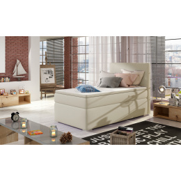 Rocco is a modest, yet tasteful, single boxspring continental bed, which is known for its functionality and maximum comfort. The furniture, with a sleeping surface of 90 x 200 cm, has been filled with a 20 cm high bonell mattress, which is reinforced with two additional layers of T25 foam, located at the top and bottom of the mattress. In addition, a topper made of T21 foam with a thickness of 4 cm also deserves a distinction. Among the distinctive features of this model we can include: a spacious bedding container divided into three parts, a high headrest, elegant metal legs, as well as the ability to choose upholstery from the available wide range of colors.