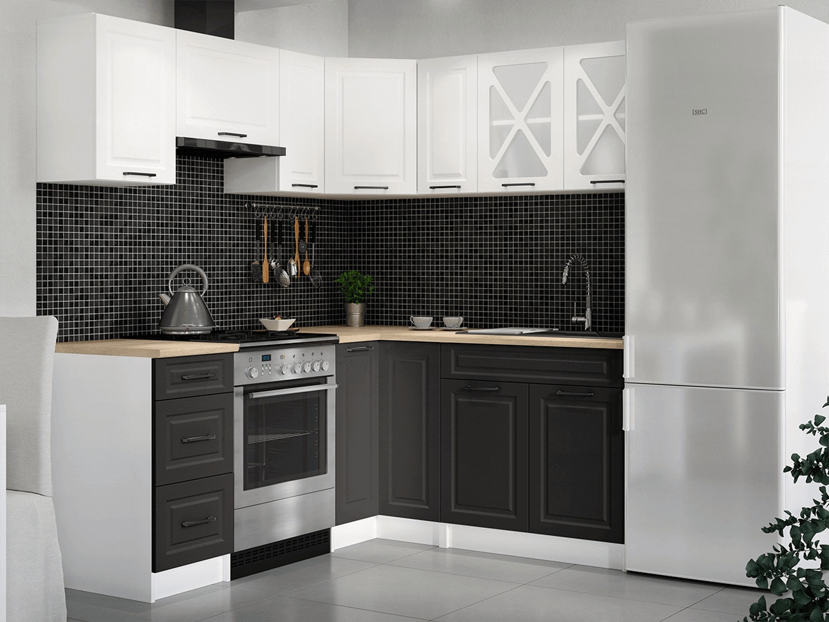 Kuchyňská linka Astra je vyrobená ve venkovském stylu, který se hodí do kuchyně v paneláku i v rodinném domě. Tento styl má jedinečnou schopnost proměnit Vaši kuchyň v útulnou a zároveň funkční místnost, kde bude radost vařit i péct. Rohová kuchyňská linka Astra nabízí dostatek úložného i pracovního prostoru. Kuchyňské skříňky jsou samostatné, takže si je můžete sestavit podle potřeby tak, jak Vám to vyhovuje. Korpusy skříněk jsou vyrobené z lamina 18 mm s hranami ABS a dvířka jsou MDF 16mm. Všechny skříňky jsou dodávány v demontu. Součástí balení je montážní plánek včetně všech potřebných spojovacích prvků. Cena je uvedena za sestavu vyobrazenou na úvodní fotografii BEZ PRACOVNÍ DESKY, s úchytkami, které jsou vyobrazeny v doplňkových fotografiích. Pracovní desku lze dokoupit nad každou skříňku zvlášť podle její šíře. Vyobrazené spotřebiče, dřez, baterie, doplňky a dekorace nejsou v ceně. Kuchyň bude dodaná s bílými korpusy a dvířky v dekóru bílá a grafit. Zobrazení barev na fotografii se může od skutečnosti lišit.