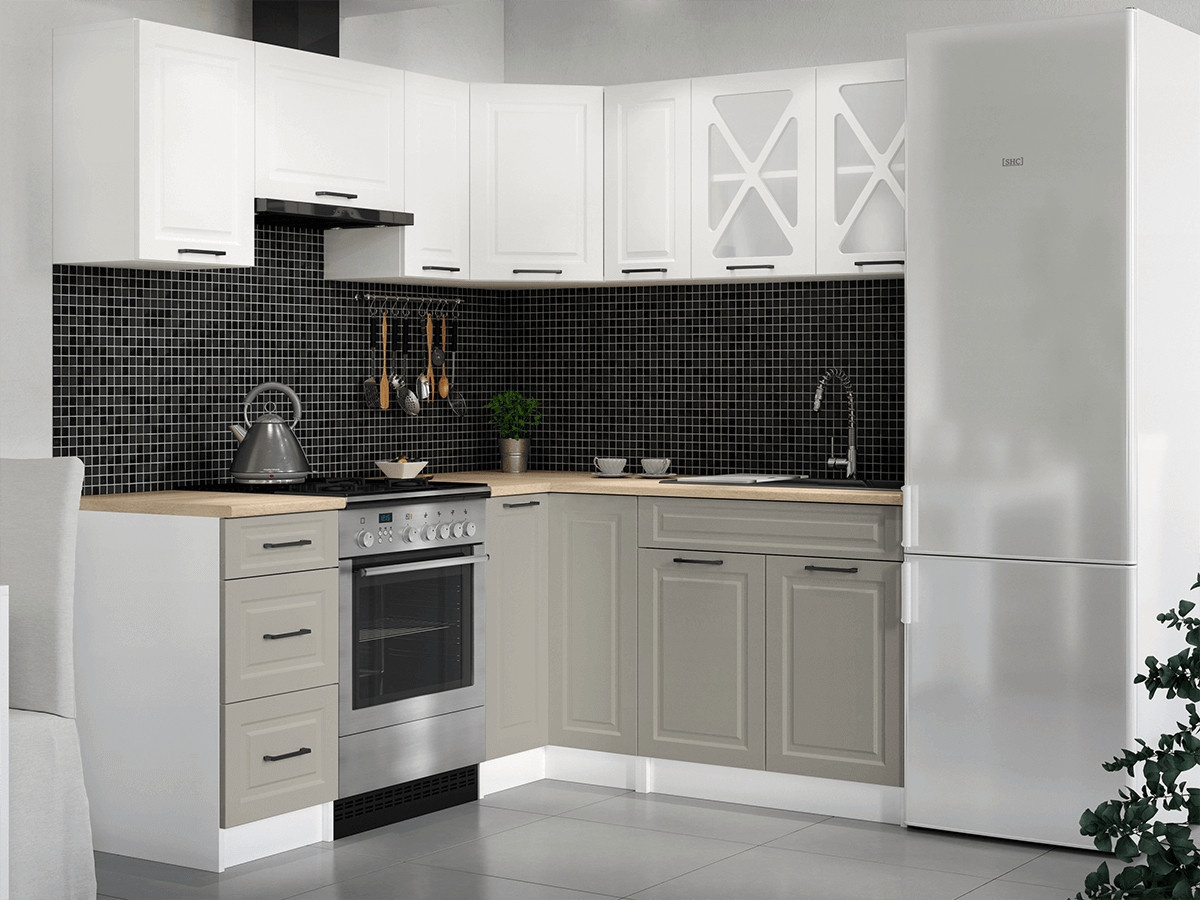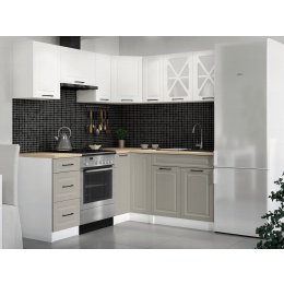 Kuchyňská linka Astra je vyrobená ve venkovském stylu, který se hodí do kuchyně v paneláku i v rodinném domě. Tento styl má jedinečnou schopnost proměnit Vaši kuchyň v útulnou a zároveň funkční místnost, kde bude radost vařit i péct. Rohová kuchyňská linka Astra nabízí dostatek úložného i pracovního prostoru. Kuchyňské skříňky jsou samostatné, takže si je můžete sestavit podle potřeby tak, jak Vám to vyhovuje. Korpusy skříněk jsou vyrobené z lamina 18 mm s hranami ABS a dvířka jsou MDF 16mm. Všechny skříňky jsou dodávány v demontu. Součástí balení je montážní plánek včetně všech potřebných spojovacích prvků. Cena je uvedena za sestavu vyobrazenou na úvodní fotografii BEZ PRACOVNÍ DESKY, s úchytkami, které jsou vyobrazeny v doplňkových fotografiích. Pracovní desku lze dokoupit nad každou skříňku zvlášť podle její šíře. Vyobrazené spotřebiče, dřez, baterie, doplňky a dekorace nejsou v ceně. Kuchyň bude dodaná s bílými korpusy a dvířky v dekóru bílá a světle šedá. Zobrazení barev na fotografii se může od skutečnosti lišit.