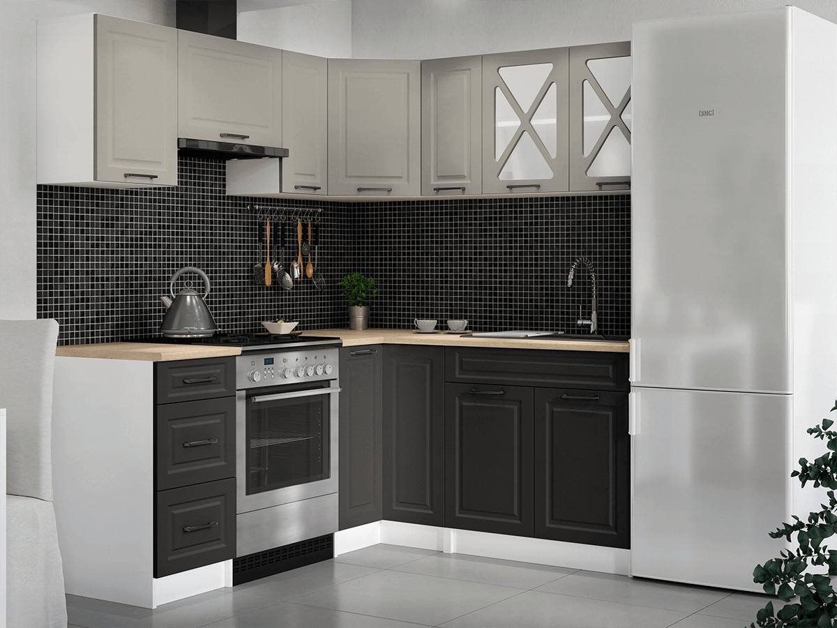 Kuchyňská linka Astra je vyrobená ve venkovském stylu, který se hodí do kuchyně v paneláku i v rodinném domě. Tento styl má jedinečnou schopnost proměnit Vaši kuchyň v útulnou a zároveň funkční místnost, kde bude radost vařit i péct. Rohová kuchyňská linka Astra nabízí dostatek úložného i pracovního prostoru. Kuchyňské skříňky jsou samostatné, takže si je můžete sestavit podle potřeby tak, jak Vám to vyhovuje. Korpusy skříněk jsou vyrobené z lamina 18 mm s hranami ABS a dvířka jsou MDF 16mm. Všechny skříňky jsou dodávány v demontu. Součástí balení je montážní plánek včetně všech potřebných spojovacích prvků. Cena je uvedena za sestavu vyobrazenou na úvodní fotografii BEZ PRACOVNÍ DESKY, s úchytkami, které jsou vyobrazeny v doplňkových fotografiích. Pracovní desku lze dokoupit nad každou skříňku zvlášť podle její šíře. Vyobrazené spotřebiče, dřez, baterie, doplňky a dekorace nejsou v ceně. Kuchyň bude dodaná s bílými korpusy a dvířky v dekóru světle šedá a grafit. Zobrazení barev na fotografii se může od skutečnosti lišit.