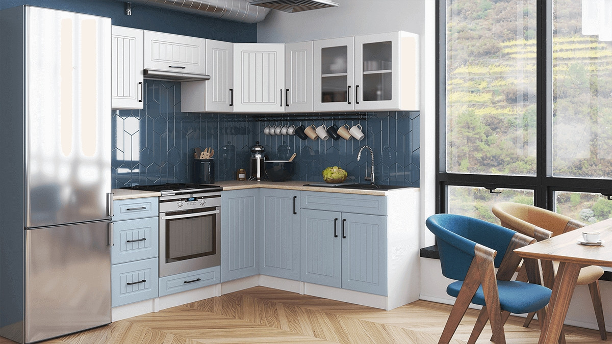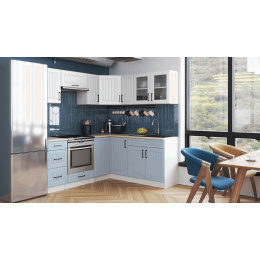 Kuchyňská linka Romana je vyrobená ve venkovském stylu, který se hodí do kuchyně v paneláku i v rodinném domě. Tento styl má jedinečnou schopnost proměnit Vaši kuchyň v útulnou a zároveň funkční místnost, kde bude radost vařit i péct. Rohová kuchyňská linka Romana nabízí dostatek úložného i pracovního prostoru. Kuchyňské skříňky jsou samostatné, takže si je můžete sestavit podle potřeby tak, jak Vám to vyhovuje. Korpusy skříněk jsou vyrobené z lamina 18 mm s hranami ABS a dvířka jsou MDF 16mm. Všechny skříňky jsou dodávány v demontu. Součástí balení je montážní plánek včetně všech potřebných spojovacích prvků. Cena je uvedena za sestavu vyobrazenou na úvodní fotografii BEZ PRACOVNÍ DESKY, s úchytkami, které jsou vyobrazeny v doplňkových fotografiích. Pracovní desku lze dokoupit nad každou skříňku zvlášť podle její šíře. Vyobrazené spotřebiče, dřez, baterie, doplňky a dekorace nejsou v ceně. Kuchyň bude dodaná s bílými korpusy a dvířky v dekóru bílá a modrá. Zobrazení barev na fotografii se může od skutečnosti lišit.