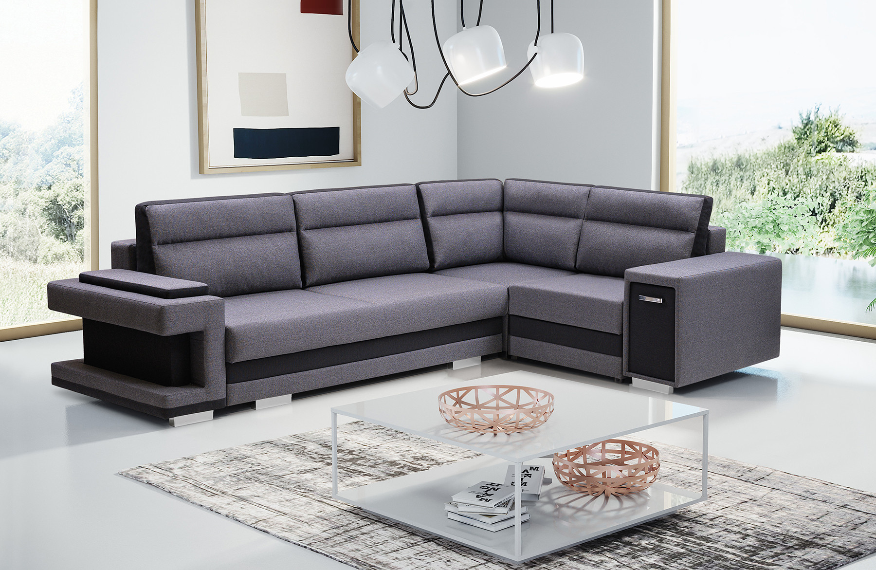 je rohová sedací souprava, která se bude skvěle vyjímat ve volném prostoru obývacího pokoje zařízeného v moderní estetice. Elegantní rohová sedací souprava s vestavěnými dvěma praktickými úložnými prostory a kontejnerem na lůžkoviny je volně stojící kus nábytku, takže ji lze umístit jak ke stěně, tak do centrální části místnosti. Rohová pohovka pro více osob je umístěna na dřevěném rámu. Moderní design doplňují chromované nohy, které nejen působivě vypadají, ale také zaručují odpovídající odolnost a stabilitu nábytku.