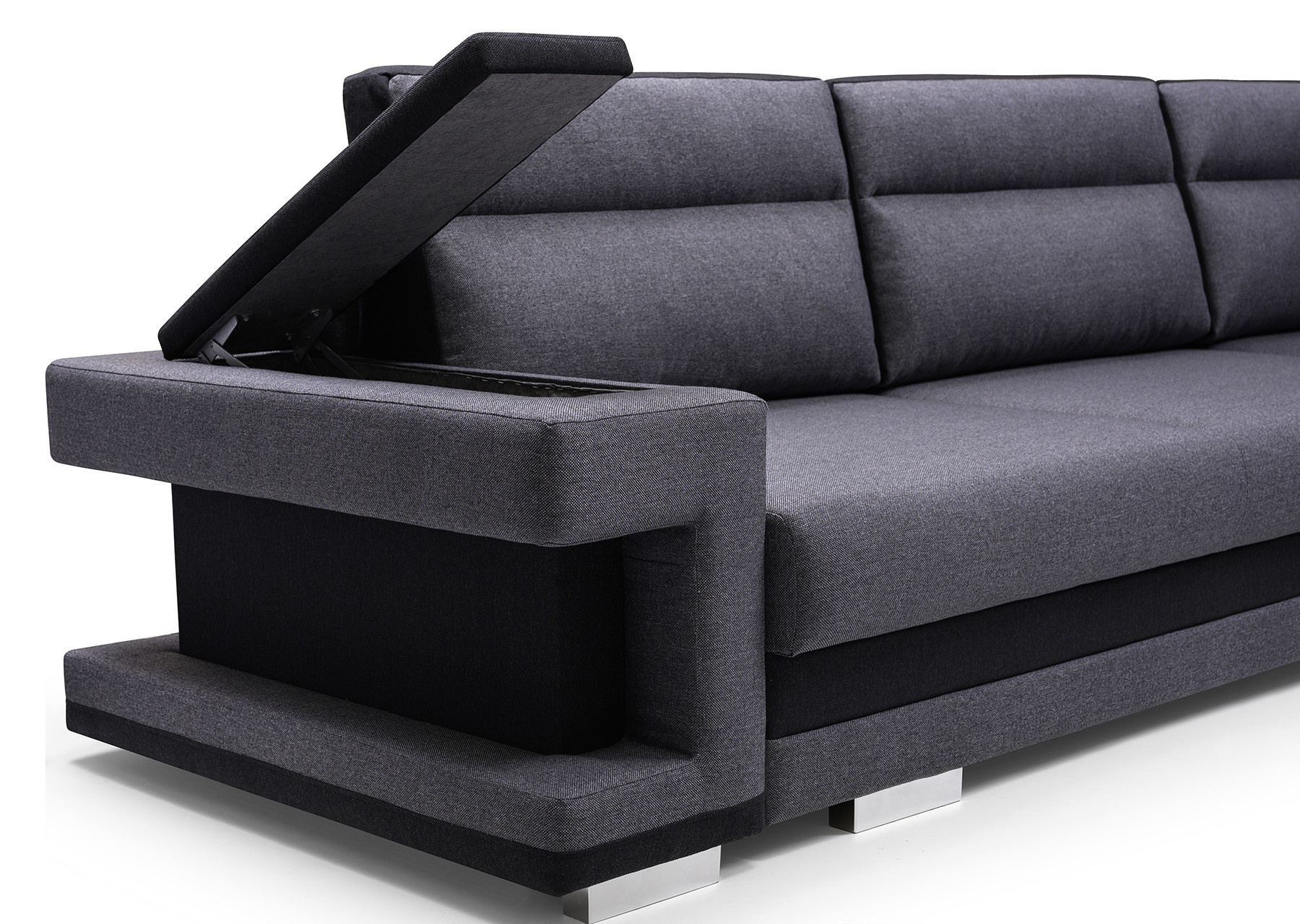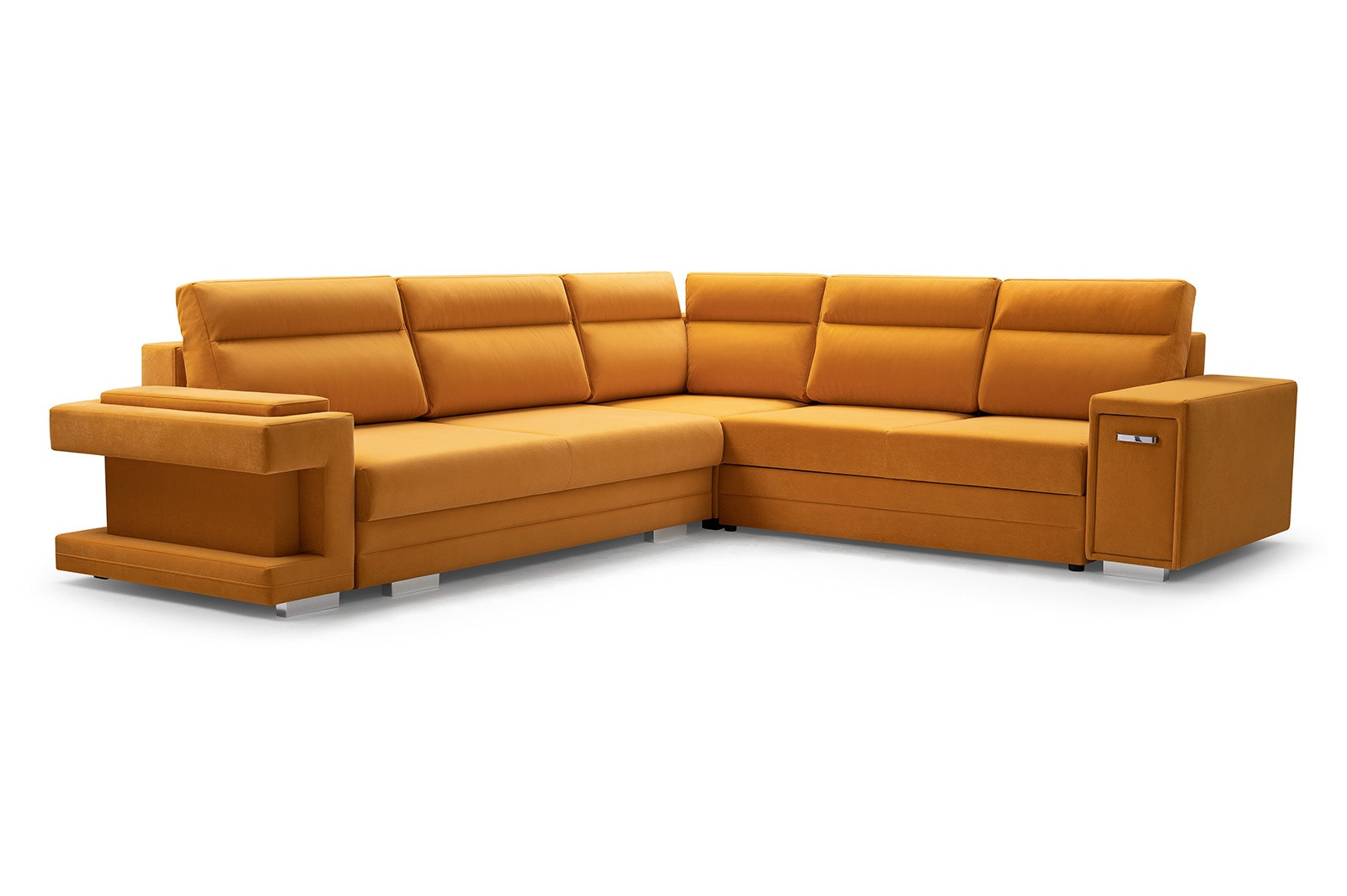 Rozkládací pohovka A2 ve tvaru písmene L je k dispozici v pravém i levém provedení, takže si ji každý bude moci přizpůsobit tvaru a rozměrům zařízeného interiéru. Model A2 s funkcí spaní je vybaven automatickou jednotkou MOS pro snadné rozložení; pod sedadlem je k dispozici prostorný úložný prostor na lůžkoviny. Rohová pohovka stojí na dřevěném rámu a chromovaných nohách, které zajišťují odolnost a stabilitu nábytku. Volně stojící kus nábytku A2 je na sedáku a opěráku vyplněn vlnitou pružinou a čalounickou pěnou T-30, které zajišťují odpovídající pružnost. Součástí rohové sedací soupravy jsou polštáře, které lze umístit na opěradlo - jsou ozdobně prošité a dodávají jí moderní vzhled. Nábytek je čalouněný látkou, jejíž barvy si lze vybrat podle individuálních preferencí ze vzorníku barev. Rohovou sedací soupravu s bočnicemi lze umístit jak do rohu místnosti, tak do jejího středu - zadní část nábytku je navíc esteticky čalouněná. Model A2 má dva vestavěné praktické úložné prostory - jeden je k dispozici ve formě výsuvné zásuvky, druhý je umístěn v jedné z područek. Rohová sedačka pro více osob nejen podtrhne jedinečný charakter zařízeného interiéru, ale také poskytne pohodlí a komfort i při mnohahodinovém odpočinku po náročném dni.