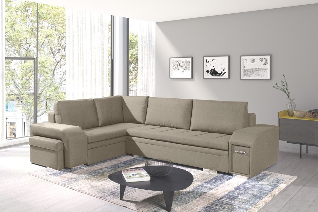 Rozkládací rohová pohovka AIL je obývací nábytek s funkcí spaní, který je k dispozici v pravé nebo levé variantě. Stylová rohová pohovka se dvěma přihrádkami na lůžkoviny je vybavena speciální automatickou funkcí pro snadné rozložení, takže budete mít rychlý přístup k přikrývkám a polštářům a zároveň si vytvoříte prostor na spaní. Rohová sedací souprava s bočnicemi je nábytek pro více osob, jehož moderní estetiku podtrhují chromované nohy. Čalouněná rohová sedací souprava do obývacího pokoje je kus nábytku s vestavěným úložným prostorem a vestavěným prostorem pro taburet, který je k dispozici v sadě. Taburet AIL bude nejen dekorativním prvkem interiéru, ale poskytne také další místo k sezení a bude užitečný i jako praktická opěrka nohou. Rohová sedací souprava s dřevěným rámem se vyznačuje zvýšenou odolností a stabilitou, díky čemuž na ní může odpočívat mnoho lidí. Dekorativně prošívaný sedák a mírně profilovaný opěrák jsou vyplněny čalounickou pěnou T-30 a vlnitými pružinami, díky nimž uživatel získá maximální pohodlí při sezení. Model AIL je nábytek vyrobený na zakázku, takže si můžete vybrat barvu čalounění podle svých individuálních preferencí.