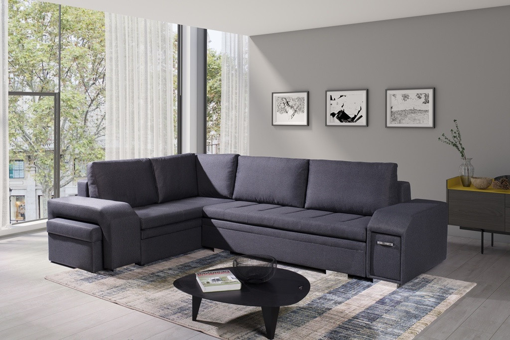 Rozkládací rohová pohovka AIL je obývací nábytek s funkcí spaní, který je k dispozici v pravé nebo levé variantě. Stylová rohová pohovka se dvěma přihrádkami na lůžkoviny je vybavena speciální automatickou funkcí pro snadné rozložení, takže budete mít rychlý přístup k přikrývkám a polštářům a zároveň si vytvoříte prostor na spaní. Rohová sedací souprava s bočnicemi je nábytek pro více osob, jehož moderní estetiku podtrhují chromované nohy. Čalouněná rohová sedací souprava do obývacího pokoje je kus nábytku s vestavěným úložným prostorem a vestavěným prostorem pro taburet, který je k dispozici v sadě. Taburet AIL bude nejen dekorativním prvkem interiéru, ale poskytne také další místo k sezení a bude užitečný i jako praktická opěrka nohou. Rohová sedací souprava s dřevěným rámem se vyznačuje zvýšenou odolností a stabilitou, díky čemuž na ní může odpočívat mnoho lidí. Dekorativně prošívaný sedák a mírně profilovaný opěrák jsou vyplněny čalounickou pěnou T-30 a vlnitými pružinami, díky nimž uživatel získá maximální pohodlí při sezení. Model AIL je nábytek vyrobený na zakázku, takže si můžete vybrat barvu čalounění podle svých individuálních preferencí.