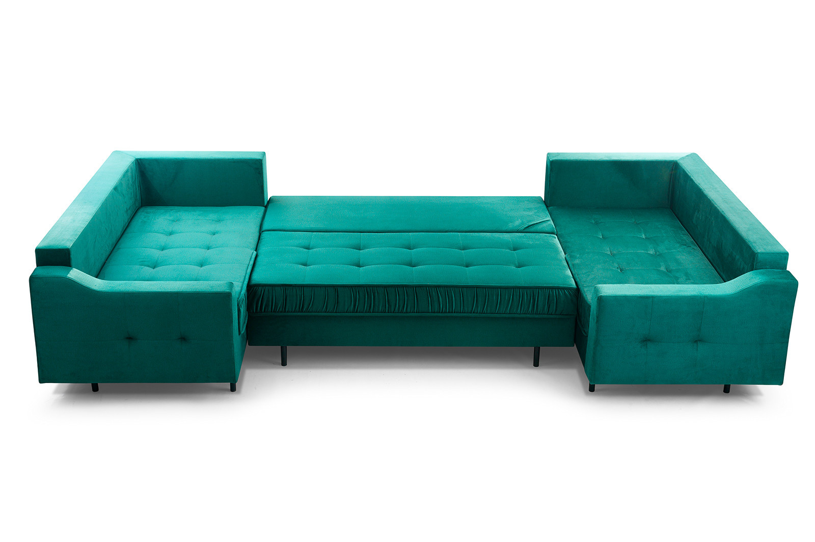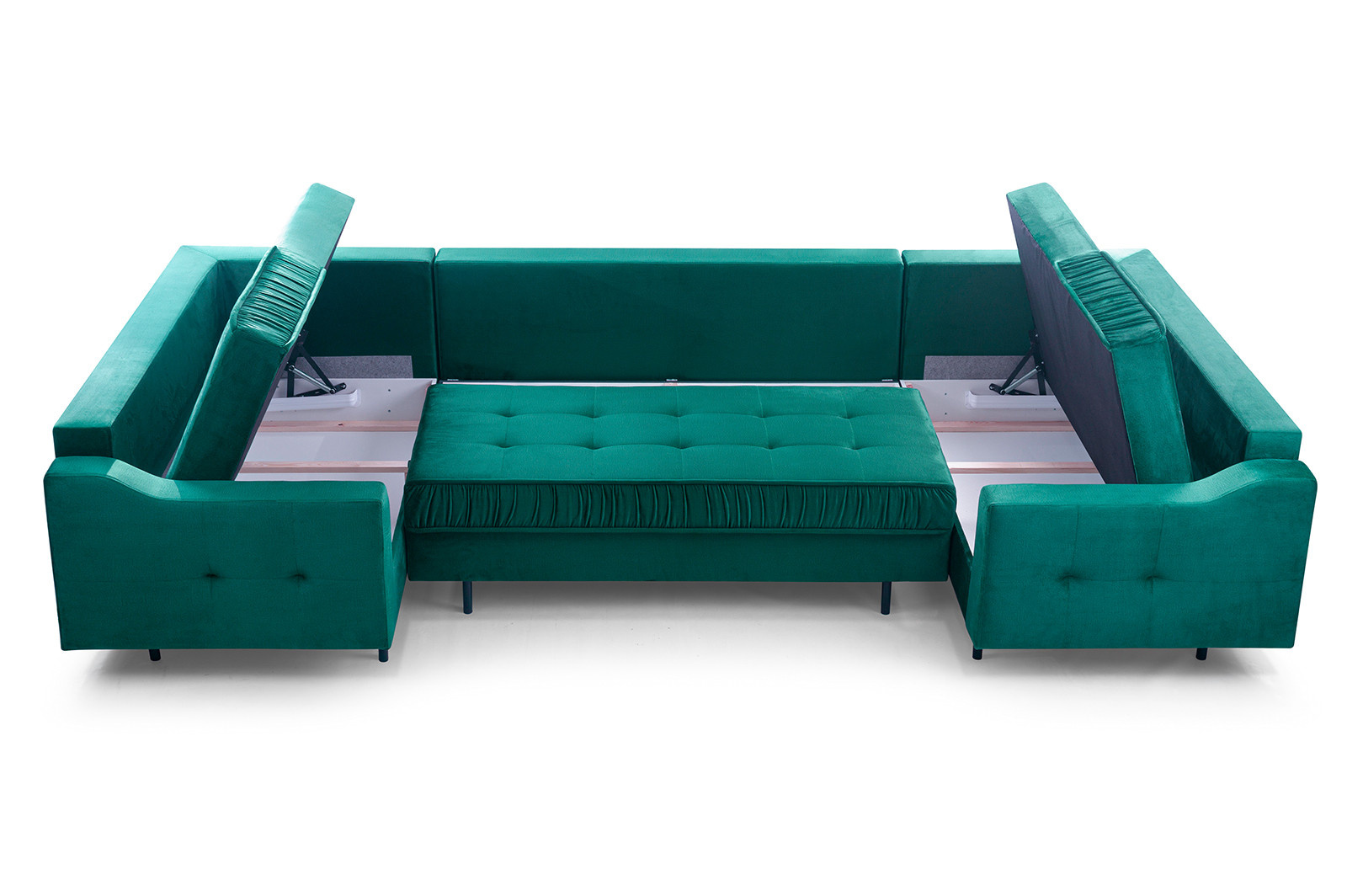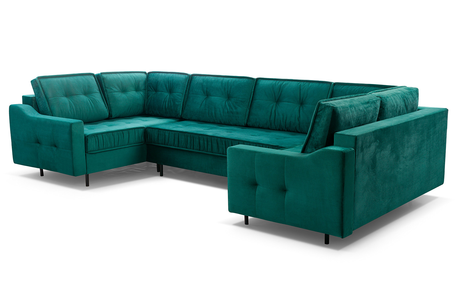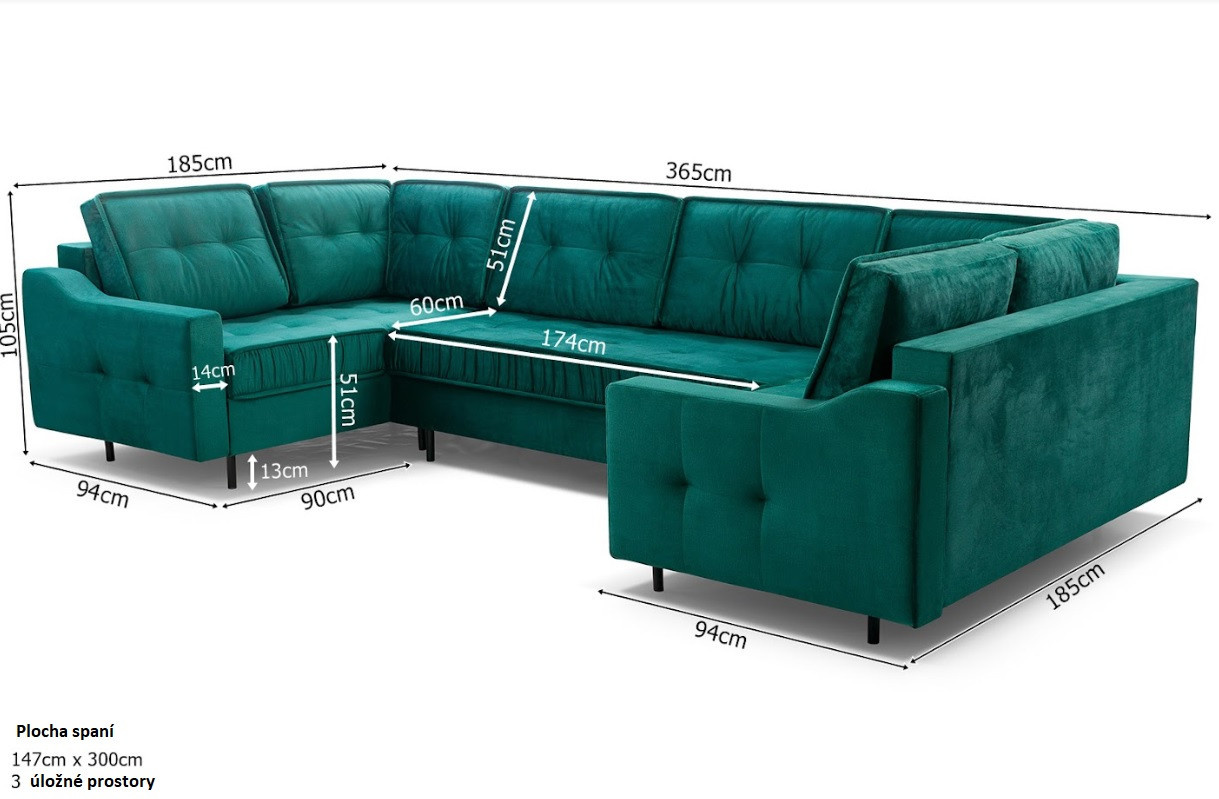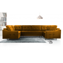 Rohová sedací souprava AKITA U je elegantní sedací souprava ve tvaru písmene U, která má poměrně univerzální tvar, takže ji lze bez větších problémů umístit ke stěně i doprostřed místnosti - jedná se o volně stojící kus nábytku s čalouněným opěradlem. Rozkládací rohová sedačka s rozkládáním, je vybavena třemi úložnými prostory a má funkci spaní. Stabilní a odolnou konstrukci tvoří dřevěný rám a prostor pod čalouněním je zakončen vlnitou pružinou a čalounickou pěnou, díky níž na nábytku nezůstanou nevzhledné otlaky ani deformace. Akcentem, který nábytku dodává originalitu a lehkost, jsou ozdobné černé nohy. Rohová pohovka pro více osob je kus nábytku plně čalouněný kvalitní látkou, jejíž barevné provedení si můžete vybrat. Rohová sedací souprava AKITA U s bočnicemi v základním provedení . Sedací soupravu lze umístit doprostřed místnosti.
