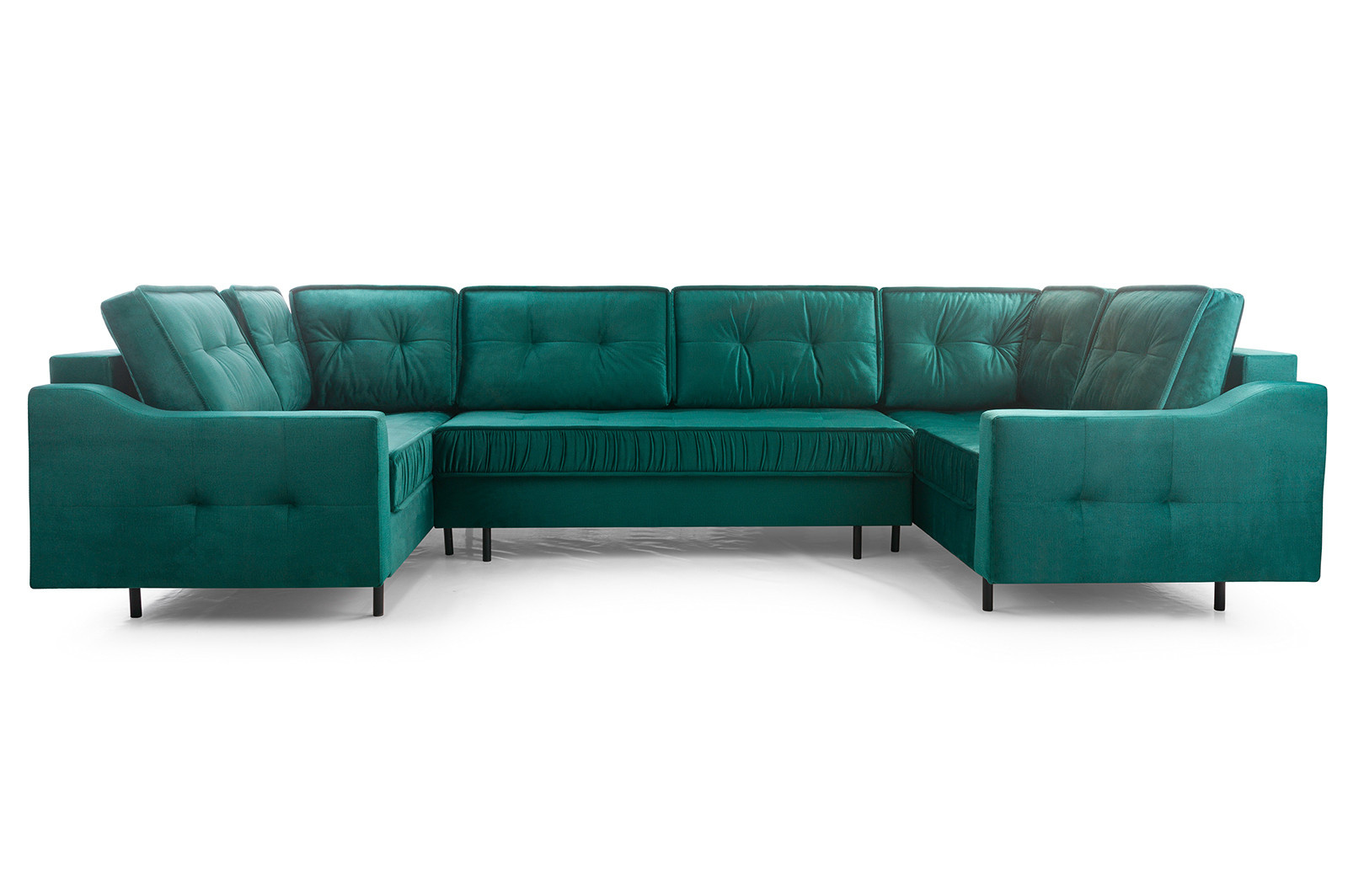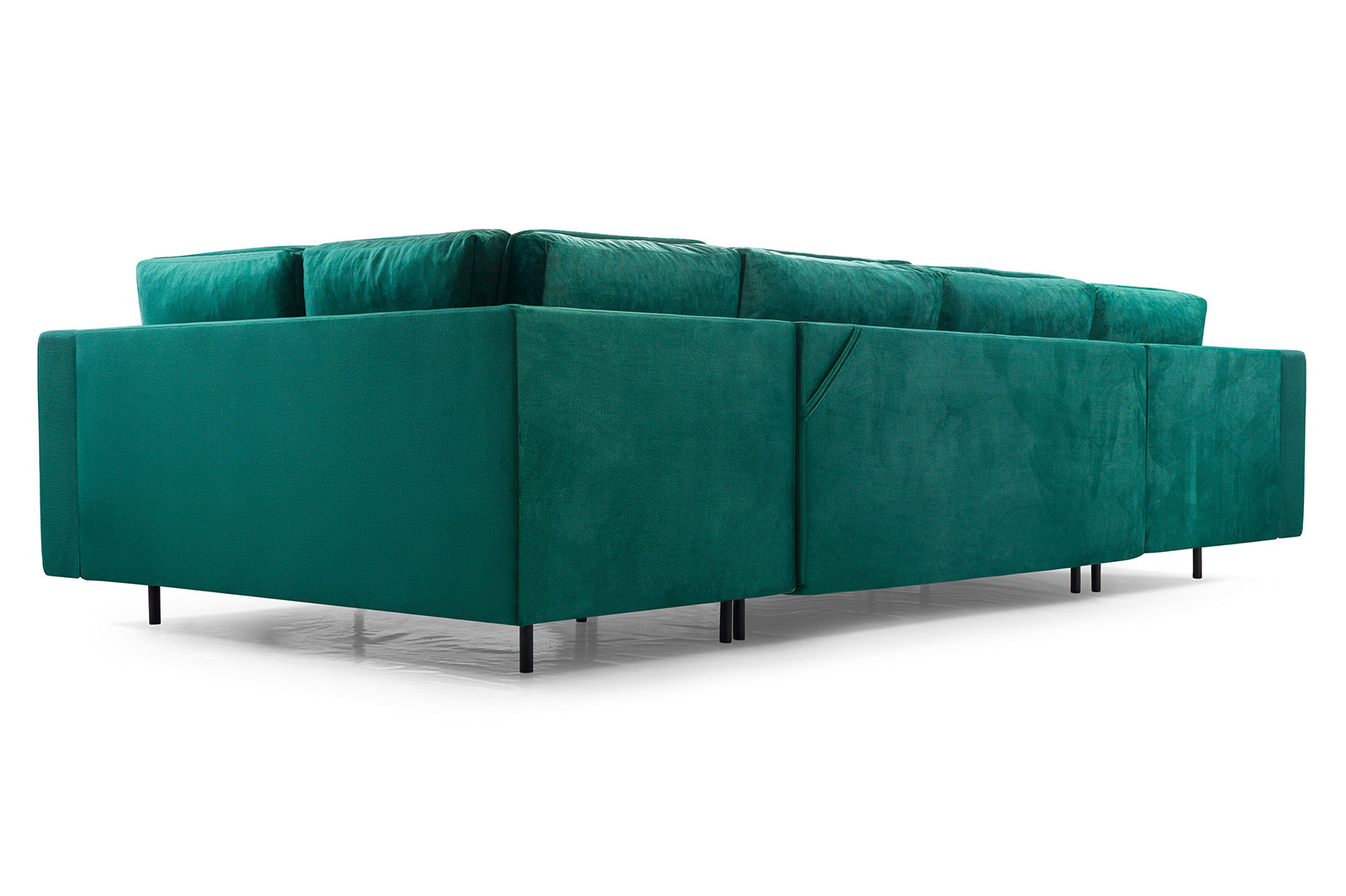 Rohová sedací souprava AKITA U je elegantní sedací souprava ve tvaru písmene U, která má poměrně univerzální tvar, takže ji lze bez větších problémů umístit ke stěně i doprostřed místnosti - jedná se o volně stojící kus nábytku s čalouněným opěradlem. Rozkládací rohová sedačka s rozkládáním, je vybavena třemi úložnými prostory a má funkci spaní. Stabilní a odolnou konstrukci tvoří dřevěný rám a prostor pod čalouněním je zakončen vlnitou pružinou a čalounickou pěnou, díky níž na nábytku nezůstanou nevzhledné otlaky ani deformace. Akcentem, který nábytku dodává originalitu a lehkost, jsou ozdobné černé nohy. Rohová pohovka pro více osob je kus nábytku plně čalouněný kvalitní látkou, jejíž barevné provedení si můžete vybrat. Rohová sedací souprava AKITA U s bočnicemi v základním provedení . Sedací soupravu lze umístit doprostřed místnosti.