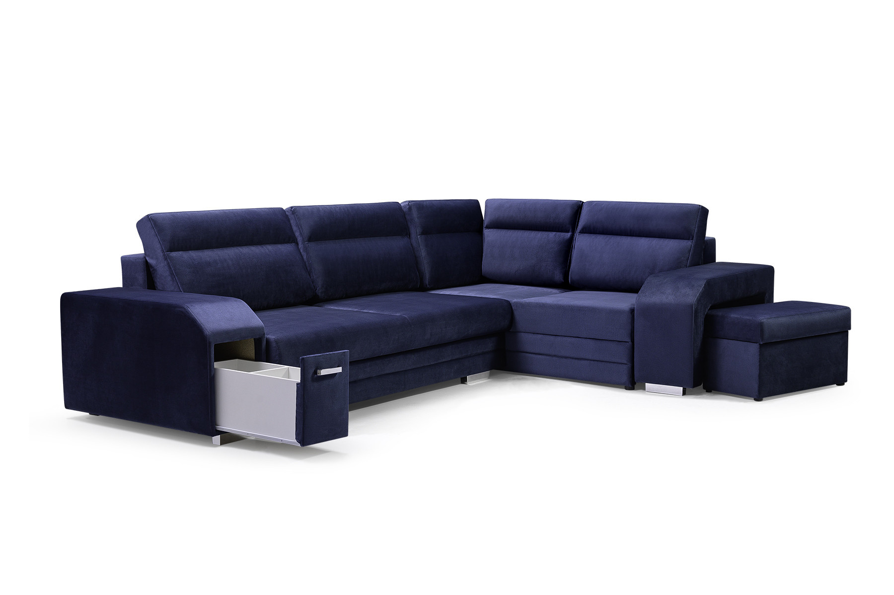 ALVARES je elegantní rohová sedací souprava ve tvaru písmene L s bočnicemi, která upoutá pozornost chromovanými nožičkami a úchytem spojeným s praktickým úložným prostorem na drobné doplňky. Stabilní konstrukce v podobě dřevěného rámu je k dispozici v pravostranném nebo levostranném provedení, takže si každý zákazník může prezentovaný model přizpůsobit individuálním preferencím i prostorovým možnostem. Rozkládací rohová sedací souprava je vybavena automatickým rozkládáním, díky kterému budete moci efektivně nahlédnout do dvou úložných prostorů na lůžkoviny a rohovou sedací soupravu rozložit. Zajímavým prvkem je zabudovaný prostor pro taburet v rohu, který je součástí soupravy, stejně jako ozdobné polštářky umístěné na mírně tvarovaném opěradle. Stylová rohová pohovka ALVARES s funkcí spaní je vyplněna vlnitými pružinami a čalounickou pěnou T-30, které zajišťují odpovídající odolnost a pružnost sedáku nebo opěráku. Představená rohová sedací souprava je celá čalouněná působivě vypadající látkou - je k dispozici v široké škále barev.
