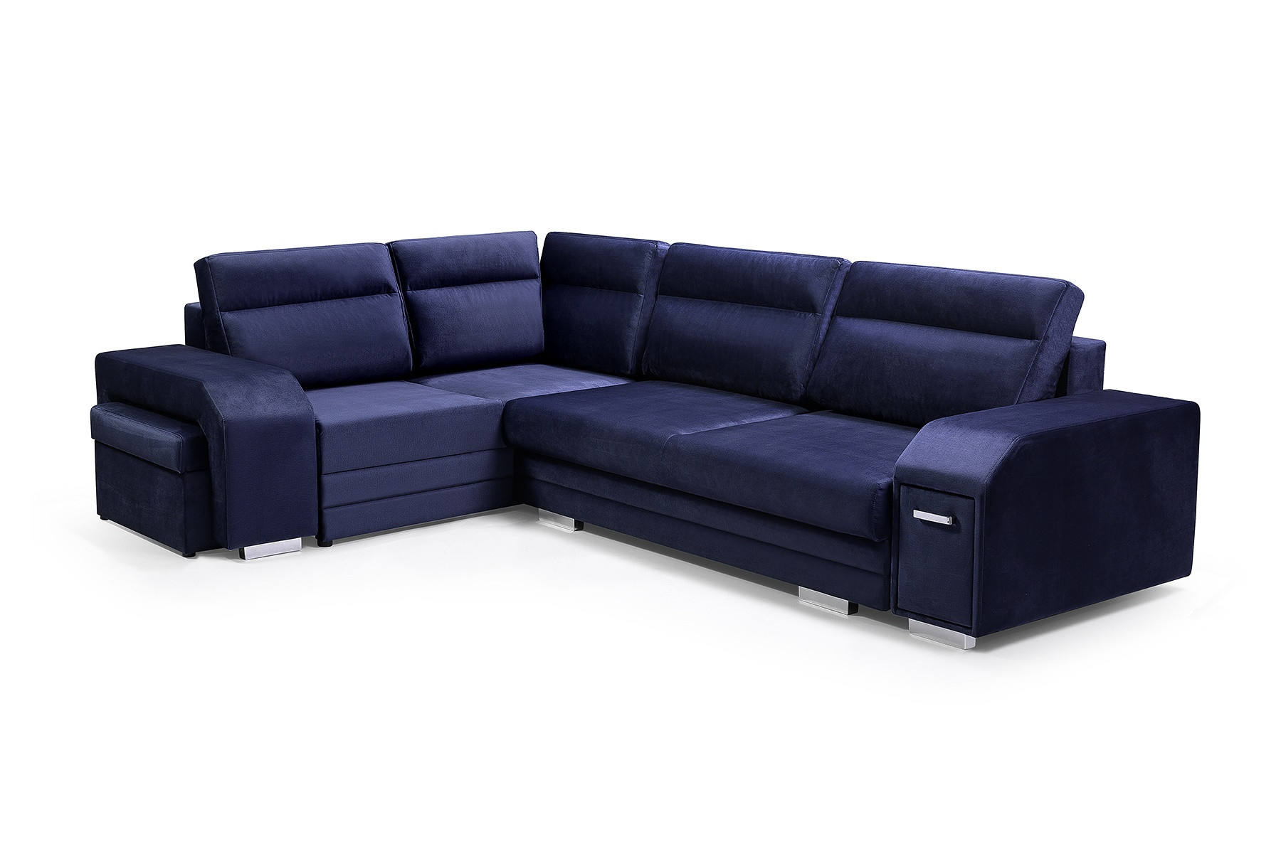 ALVARES je elegantní rohová sedací souprava ve tvaru písmene L s bočnicemi, která upoutá pozornost chromovanými nožičkami a úchytem spojeným s praktickým úložným prostorem na drobné doplňky. Stabilní konstrukce v podobě dřevěného rámu je k dispozici v pravostranném nebo levostranném provedení, takže si každý zákazník může prezentovaný model přizpůsobit individuálním preferencím i prostorovým možnostem. Rozkládací rohová sedací souprava je vybavena automatickým rozkládáním, díky kterému budete moci efektivně nahlédnout do dvou úložných prostorů na lůžkoviny a rohovou sedací soupravu rozložit. Zajímavým prvkem je zabudovaný prostor pro taburet v rohu, který je součástí soupravy, stejně jako ozdobné polštářky umístěné na mírně tvarovaném opěradle. Stylová rohová pohovka ALVARES s funkcí spaní je vyplněna vlnitými pružinami a čalounickou pěnou T-30, které zajišťují odpovídající odolnost a pružnost sedáku nebo opěráku. Představená rohová sedací souprava je celá čalouněná působivě vypadající látkou - je k dispozici v široké škále barev.