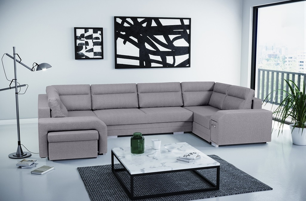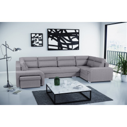 Rohová sedací souprava ALVARES U do obývacího pokoje je navíc vybavena automatickým rozkládáním - rohová sedací souprava má funkci spaní, díky které se můžete spolehnout na bezpečný a pohodlný spánek. Rám nábytku je vyroben ze dřeva a poté je opatřen chromovanými nohami. K rohové sedací soupravě patří taburet - v nábytku je pro něj zabudováno speciální místo a praktický úložný prostor v podobě výsuvné zásuvky na drobné doplňky. Součástí sady jsou také polštáře umístěné na opěradle. Spací plocha modelu ALVARES U je vyplněna čalounickou pěnou T-30 a vlnitými pružinami. Kolem prezentované rohové sedací soupravy jistě nikdo neprojde lhostejně - nábytek je praktický pro každodenní použití a zároveň poskytuje pohodlí i při mnohahodinovém odpočinku.