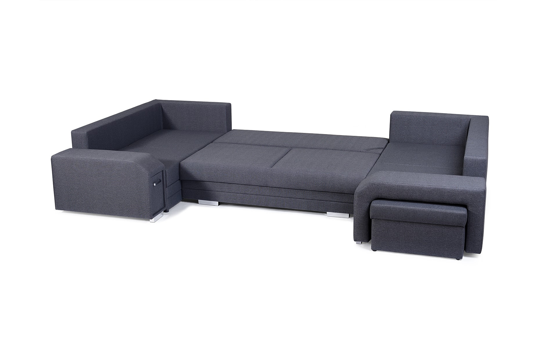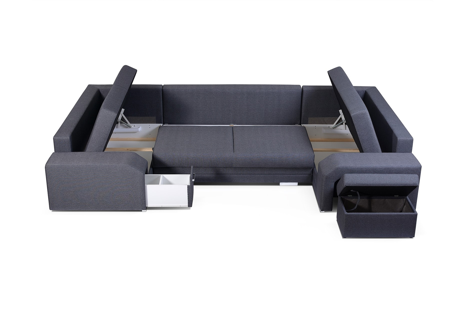 ALVARES U je masivní rohová sedací souprava ve tvaru U, která se vyrábí na objednávku. Rozkládací rohová pohovka je k dispozici v pravém nebo levém provedení, takže ji lze plně přizpůsobit individuálním preferencím a tvaru místnosti. Volně stojící kus nábytku je celý čalouněný látkou. Rohová pohovka je vybavena třemi prostornými kontejnery na lůžkoviny, do kterých se vejdou nejen přikrývky, peřiny a polštáře, ale také předměty, které chceme mít po ruce, ale nemáme pro ně dostatek místa ve skříních nebo zásuvkách.