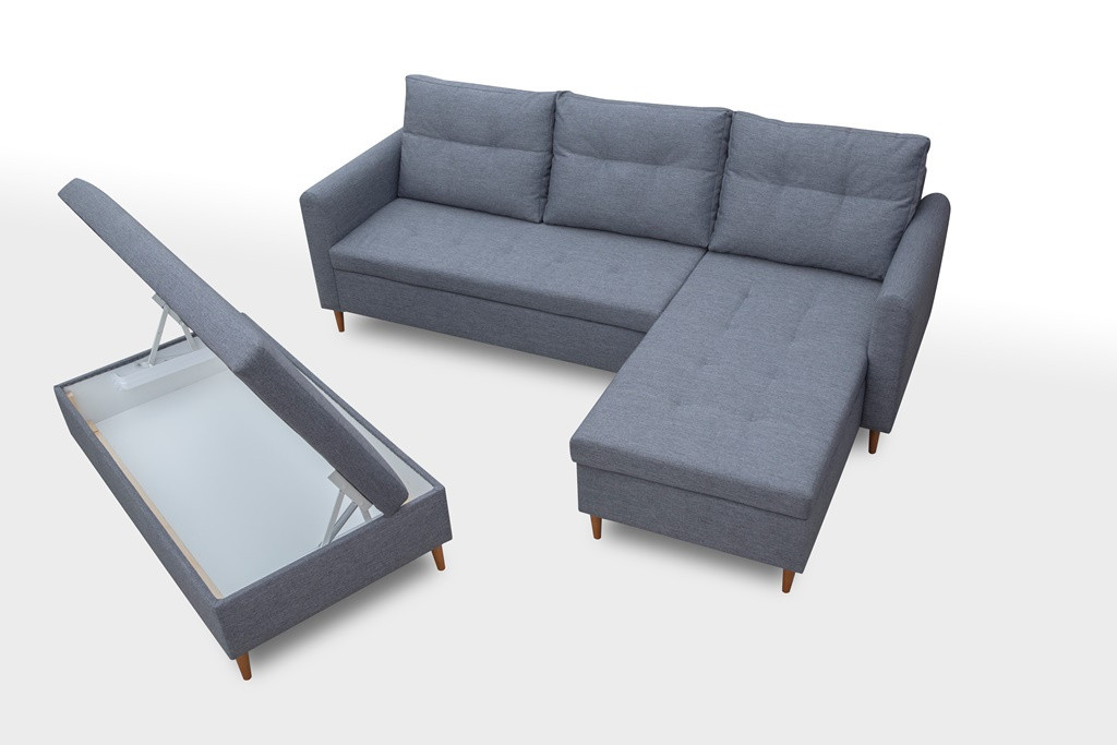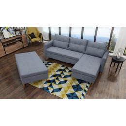 Stylová pohovka AREO s praktickým taburetem je nábytek, který upoutá pozornost svým dekorativním prošíváním. Rohová sedací souprava s praktickými bočnicemi je k dispozici v pravém nebo levém provedení podle vašeho výběru. Po přidání taburetu k rohové pohovce můžete získat funkci spaní. Rohová sedací souprava dokončená ve skandinávském stylu je kus nábytku s čalouněným opěradlem, tedy volně stojící kus nábytku, díky čemuž lze rohovou sedací soupravu umístit nejen ke stěně místnosti, ale i do její střední části. Podstavec prezentované rohové pohovky a taburetu je vyroben z přírodního dřeva. Sedák je vyplněn vlnitou pružinou, která pomáhá udržet odpovídající pružnost konstrukce - ani přes opakované používání se na něm neobjevují nevzhledné deformace. K rohové pohovce a pufu AREO jsou dodávány dva dekorační polštáře. Praktický taburet má schránku na lůžkoviny nebo drobné každodenní doplňky. Nábytek AREO lze čalounit látkou, jejíž barvy lze vybrat z dostupného vzorníku barev.
