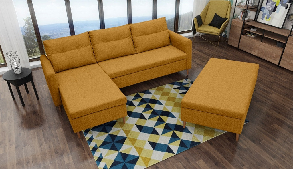 Stylová pohovka AREO s praktickým taburetem je nábytek, který upoutá pozornost svým dekorativním prošíváním. Rohová sedací souprava s praktickými bočnicemi je k dispozici v pravém nebo levém provedení podle vašeho výběru. Po přidání taburetu k rohové pohovce můžete získat funkci spaní. Rohová sedací souprava dokončená ve skandinávském stylu je kus nábytku s čalouněným opěradlem, tedy volně stojící kus nábytku, díky čemuž lze rohovou sedací soupravu umístit nejen ke stěně místnosti, ale i do její střední části. Podstavec prezentované rohové pohovky a taburetu je vyroben z přírodního dřeva. Sedák je vyplněn vlnitou pružinou, která pomáhá udržet odpovídající pružnost konstrukce - ani přes opakované používání se na něm neobjevují nevzhledné deformace. K rohové pohovce a pufu AREO jsou dodávány dva dekorační polštáře. Praktický taburet má schránku na lůžkoviny nebo drobné každodenní doplňky. Nábytek AREO lze čalounit látkou, jejíž barvy lze vybrat z dostupného vzorníku barev.