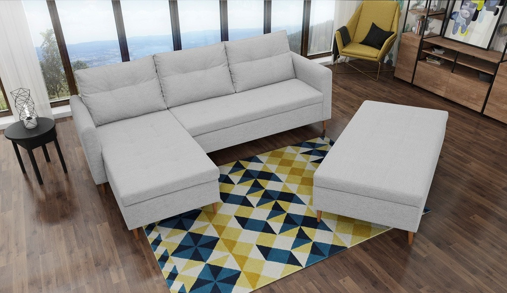Stylová pohovka AREO s praktickým taburetem je nábytek, který upoutá pozornost svým dekorativním prošíváním. Rohová sedací souprava s praktickými bočnicemi je k dispozici v pravém nebo levém provedení podle vašeho výběru. Po přidání taburetu k rohové pohovce můžete získat funkci spaní. Rohová sedací souprava dokončená ve skandinávském stylu je kus nábytku s čalouněným opěradlem, tedy volně stojící kus nábytku, díky čemuž lze rohovou sedací soupravu umístit nejen ke stěně místnosti, ale i do její střední části. Podstavec prezentované rohové pohovky a taburetu je vyroben z přírodního dřeva. Sedák je vyplněn vlnitou pružinou, která pomáhá udržet odpovídající pružnost konstrukce - ani přes opakované používání se na něm neobjevují nevzhledné deformace. K rohové pohovce a pufu AREO jsou dodávány dva dekorační polštáře. Praktický taburet má schránku na lůžkoviny nebo drobné každodenní doplňky. Nábytek AREO lze čalounit látkou, jejíž barvy lze vybrat z dostupného vzorníku barev.