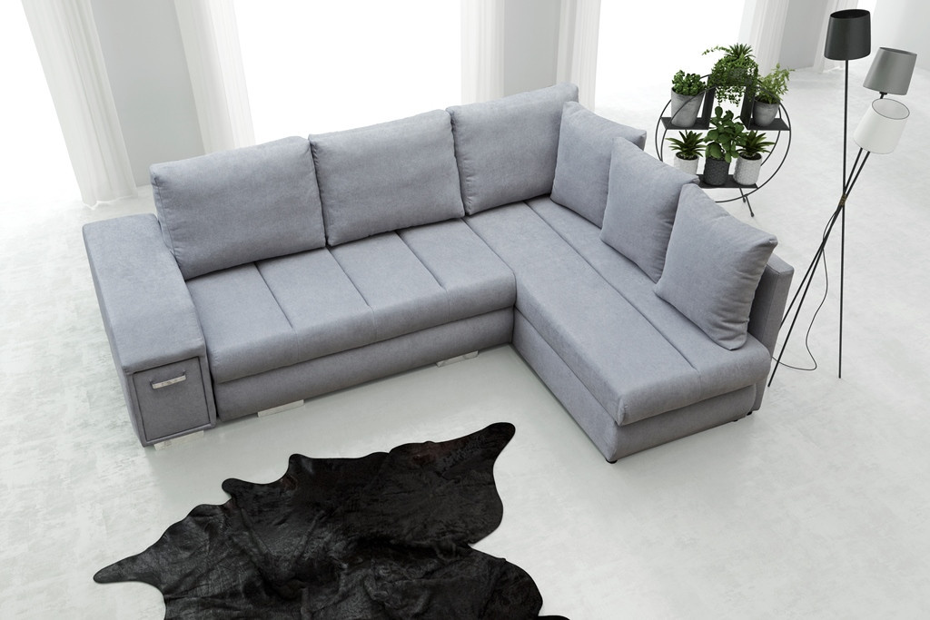 Rozkládací rohová pohovka ARNI s bočnicemi je k dispozici v pravostranném nebo levostranném provedení podle vašeho výběru. Rohová sedací souprava ve tvaru písmene L pro více osob najde své ideální místo v relaxačním a zároveň reprezentativním prostoru, například v obývacím pokoji - bude to kus nábytku zaručující pohodlí i při mnohahodinovém sezení. Model ARNI je vybaven spací funkcí, která nám umožní pohodlně a bezpečně ubytovat naše hosty. Nábytek je navržen s automatickým rozkládáním. Rohová sedací souprava je vyrobena na dřevěném rámu a čalouněna látkou, která je k dispozici v široké škále barev, z nichž si můžete vybrat. Stylová rohová sedací souprava s čalouněnými zády má dva prostorné úložné prostory na lůžkoviny a výsuvnou zásuvku se dvěma přihrádkami umístěnou v boční části, kam si můžete uložit věci, které potřebujete mít při odpočinku po ruce.