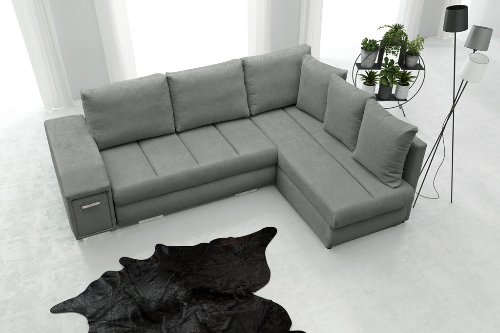 Rozkládací rohová pohovka ARNI s bočnicemi je k dispozici v pravostranném nebo levostranném provedení podle vašeho výběru. Rohová sedací souprava ve tvaru písmene L pro více osob najde své ideální místo v relaxačním a zároveň reprezentativním prostoru, například v obývacím pokoji - bude to kus nábytku zaručující pohodlí i při mnohahodinovém sezení. Model ARNI je vybaven spací funkcí, která nám umožní pohodlně a bezpečně ubytovat naše hosty. Nábytek je navržen s automatickým rozkládáním. Rohová sedací souprava je vyrobena na dřevěném rámu a čalouněna látkou, která je k dispozici v široké škále barev, z nichž si můžete vybrat. Stylová rohová sedací souprava s čalouněnými zády má dva prostorné úložné prostory na lůžkoviny a výsuvnou zásuvku se dvěma přihrádkami umístěnou v boční části, kam si můžete uložit věci, které potřebujete mít při odpočinku po ruce.