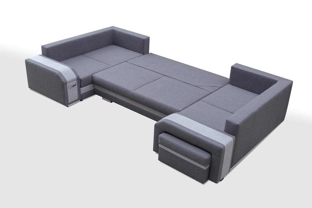 Rohová pohovka ASSAN U ve tvaru U je rozkládací jednotka s funkcí spaní, která je vybavena automatickým asistenčním systémem rozkládání. Sedací prvek pro více osob má kromě zabudovaného praktického úložného prostoru také zabudovaný prostor pro taburet, který je k dispozici v prezentované soupravě. Taburet ASSAN poslouží nejen jako další sedátko, ale bude se hodit i jako podnožka při odpočinku na rohové sedačce. Díky čalouněným zádům lze volně stojící rohovou pohovku umístit nejen ke stěně, ale také do centrální části obývacího pokoje nebo obývacího pokoje. Přes den bude rohová pohovka místem pro setkání s rodinou a přáteli, ale i pro odpočinek u televize nebo s knihou v ruce, zatímco v noci se může proměnit v pohodlné lůžko. Souprava se dodává s taburetem a rohovou sedací soupravou a s polštáři, které jsou na recenzní fotografii umístěny na mírně profilovaném opěradle. Nábytek je vybaven třemi úložnými prostory třeba na lůžkoviny, které udrží všechny polštáře, přikrývky a peřiny na svém místě. Na celé ploše pro spaní byla použita čalounická pěna T-30 a vlnitá pružina. Chromované nožky jsou zajímavým doplněním stylového designu.