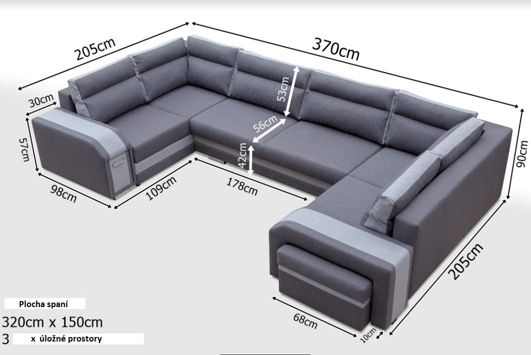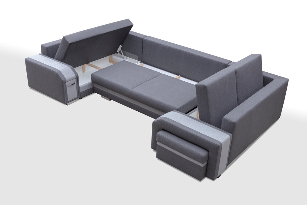 Rohová pohovka ASSAN U ve tvaru U je rozkládací jednotka s funkcí spaní, která je vybavena automatickým asistenčním systémem rozkládání. Sedací prvek pro více osob má kromě zabudovaného praktického úložného prostoru také zabudovaný prostor pro taburet, který je k dispozici v prezentované soupravě. Taburet ASSAN poslouží nejen jako další sedátko, ale bude se hodit i jako podnožka při odpočinku na rohové sedačce. Díky čalouněným zádům lze volně stojící rohovou pohovku umístit nejen ke stěně, ale také do centrální části obývacího pokoje nebo obývacího pokoje. Přes den bude rohová pohovka místem pro setkání s rodinou a přáteli, ale i pro odpočinek u televize nebo s knihou v ruce, zatímco v noci se může proměnit v pohodlné lůžko. Souprava se dodává s taburetem a rohovou sedací soupravou a s polštáři, které jsou na recenzní fotografii umístěny na mírně profilovaném opěradle. Nábytek je vybaven třemi úložnými prostory třeba na lůžkoviny, které udrží všechny polštáře, přikrývky a peřiny na svém místě. Na celé ploše pro spaní byla použita čalounická pěna T-30 a vlnitá pružina. Chromované nožky jsou zajímavým doplněním stylového designu.