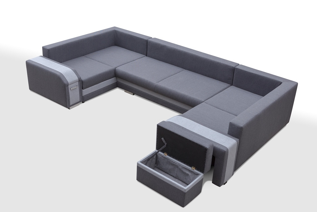 Rohová pohovka ASSAN U ve tvaru U je rozkládací jednotka s funkcí spaní, která je vybavena automatickým asistenčním systémem rozkládání. Sedací prvek pro více osob má kromě zabudovaného praktického úložného prostoru také zabudovaný prostor pro taburet, který je k dispozici v prezentované soupravě. Taburet ASSAN poslouží nejen jako další sedátko, ale bude se hodit i jako podnožka při odpočinku na rohové sedačce. Díky čalouněným zádům lze volně stojící rohovou pohovku umístit nejen ke stěně, ale také do centrální části obývacího pokoje nebo obývacího pokoje. Přes den bude rohová pohovka místem pro setkání s rodinou a přáteli, ale i pro odpočinek u televize nebo s knihou v ruce, zatímco v noci se může proměnit v pohodlné lůžko. Souprava se dodává s taburetem a rohovou sedací soupravou a s polštáři, které jsou na recenzní fotografii umístěny na mírně profilovaném opěradle. Nábytek je vybaven třemi úložnými prostory třeba na lůžkoviny, které udrží všechny polštáře, přikrývky a peřiny na svém místě. Na celé ploše pro spaní byla použita čalounická pěna T-30 a vlnitá pružina. Chromované nožky jsou zajímavým doplněním stylového designu.