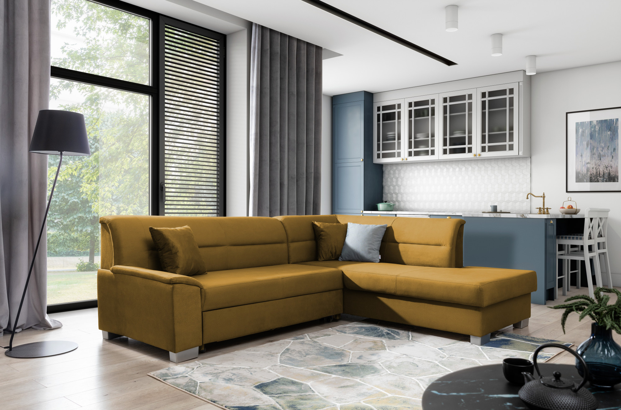 - možnost ustavení sedací soupravy do prostoru - záda sedací soupravy jsou očalouněny stejnou potahovou látkou