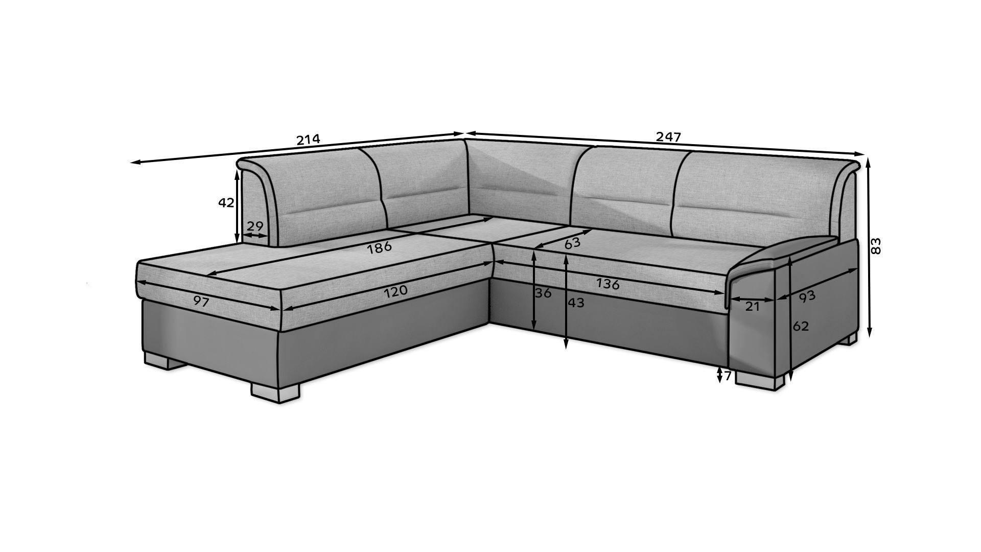 Rohová sedací souprava Bergen je vyrobena z kvalitních materiálů. Konstrukce sedací soupravy je vyrobena z kombinace dřeva a dřevotřísky. Sedací část je vyrobena v kombinaci polyuretanové pěny T3040 a pružin. Sedací souprava je rozkládací pomocí rozkládacího automatu. Sedací souprava má prostorný úložný prostor pro úschovu lůžkovin.