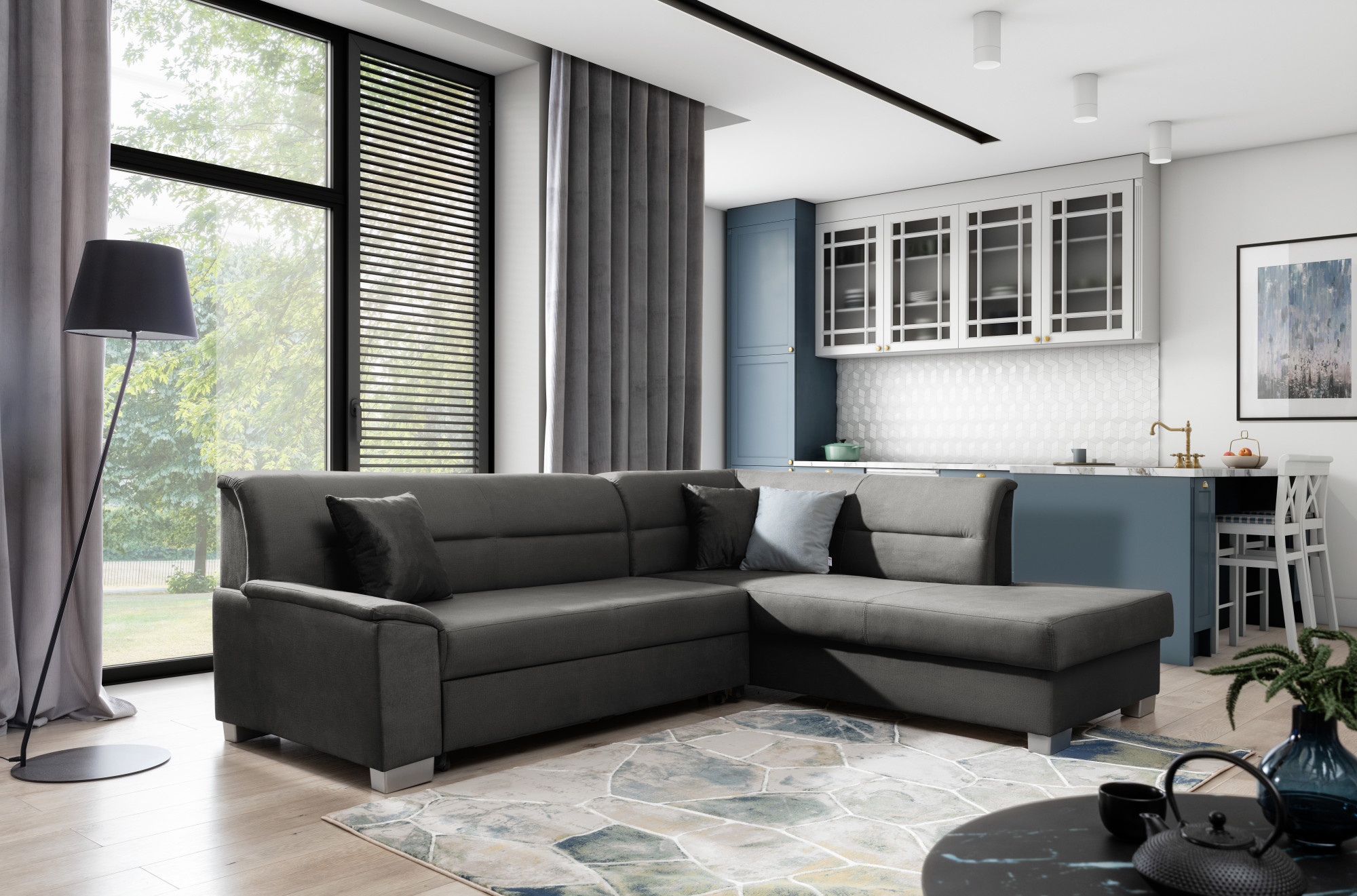 - možnost ustavení sedací soupravy do prostoru - záda sedací soupravy jsou očalouněny stejnou potahovou látkou