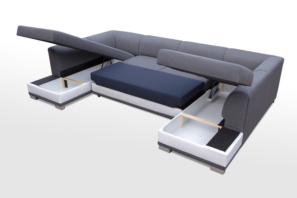 Stylová rohová pohovka DARCO do U je rozkládací pohovka, která se skvěle hodí do velkých obývacích pokojů - díky čalouněnému opěradlu ji lze umístit do jejich střední části. Dřevěný rám, který zajišťuje odolnost a stabilitu nábytku, je čalouněný látkou, jejíž povrchovou úpravu si můžete vybrat z barev dostupných ve vzorníku. Sedák je spolu s mírně profilovaným opěradlem vyplněn vlnitou pružinou a čalounickou pěnou T-30, která díky své zvýšené pružnosti zabrání vzniku nevzhledných promáčklin na nábytku. Všestranná rohová pohovka ve tvaru U je víceúčelový kus nábytku, který se vyznačuje moderním provedením zvýrazněným chromovanými nožkami a dekorativními polštáři, které jsou k dispozici jako součást soupravy. Volně stojící nábytek DARCO U je vybaven dvěma úložnými prostory a má také funkci spaní, díky níž lze nábytek bez bočnic rozložit. Model DARCO U se vyrábí také na individuální objednávku, takže je možné zvolit barvu rohových vložek.