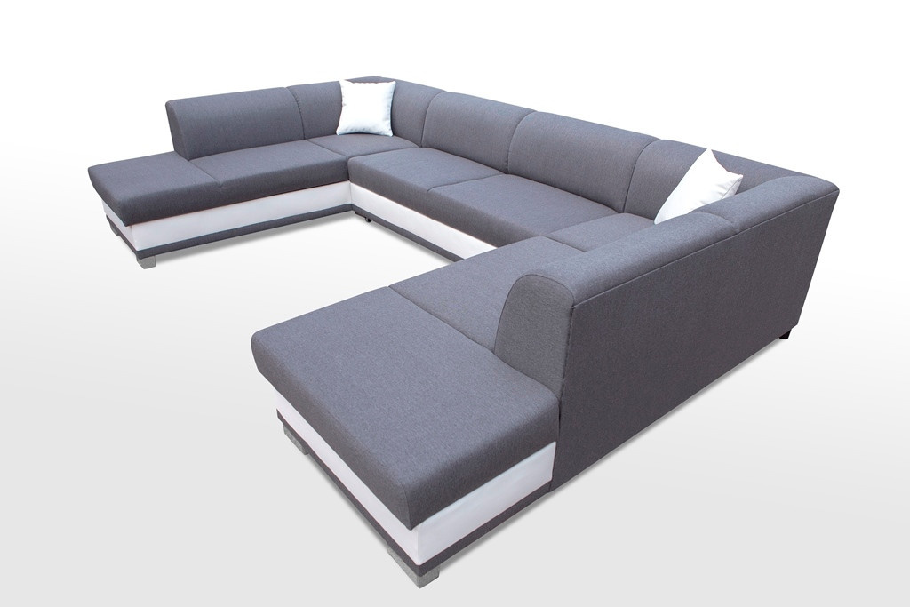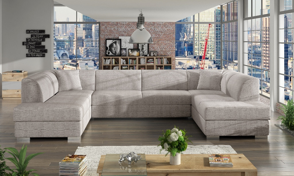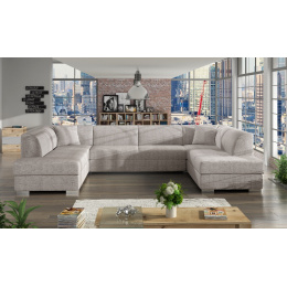 Stylová rohová pohovka DARCO do U je rozkládací pohovka, která se skvěle hodí do velkých obývacích pokojů - díky čalouněnému opěradlu ji lze umístit do jejich střední části. Dřevěný rám, který zajišťuje odolnost a stabilitu nábytku, je čalouněný látkou, jejíž povrchovou úpravu si můžete vybrat z barev dostupných ve vzorníku. Sedák je spolu s mírně profilovaným opěradlem vyplněn vlnitou pružinou a čalounickou pěnou T-30, která díky své zvýšené pružnosti zabrání vzniku nevzhledných promáčklin na nábytku. Všestranná rohová pohovka ve tvaru U je víceúčelový kus nábytku, který se vyznačuje moderním provedením zvýrazněným chromovanými nožkami a dekorativními polštáři, které jsou k dispozici jako součást soupravy. Volně stojící nábytek DARCO U je vybaven dvěma úložnými prostory a má také funkci spaní, díky níž lze nábytek bez bočnic rozložit. Model DARCO U se vyrábí také na individuální objednávku, takže je možné zvolit barvu rohových vložek.