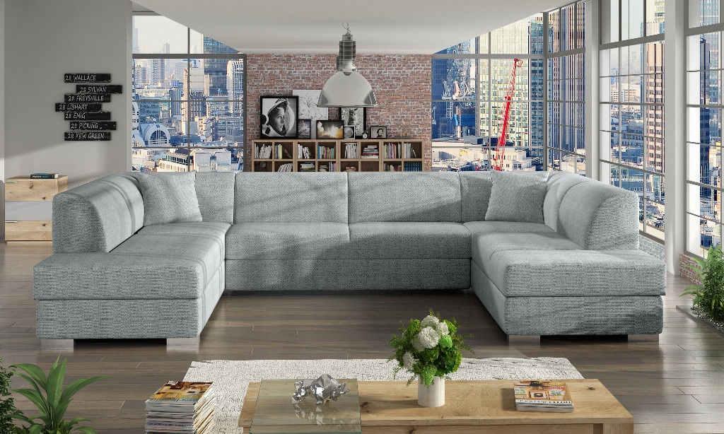 Stylová rohová pohovka DARCO do U je rozkládací pohovka, která se skvěle hodí do velkých obývacích pokojů - díky čalouněnému opěradlu ji lze umístit do jejich střední části. Dřevěný rám, který zajišťuje odolnost a stabilitu nábytku, je čalouněný látkou, jejíž povrchovou úpravu si můžete vybrat z barev dostupných ve vzorníku. Sedák je spolu s mírně profilovaným opěradlem vyplněn vlnitou pružinou a čalounickou pěnou T-30, která díky své zvýšené pružnosti zabrání vzniku nevzhledných promáčklin na nábytku. Všestranná rohová pohovka ve tvaru U je víceúčelový kus nábytku, který se vyznačuje moderním provedením zvýrazněným chromovanými nožkami a dekorativními polštáři, které jsou k dispozici jako součást soupravy. Volně stojící nábytek DARCO U je vybaven dvěma úložnými prostory a má také funkci spaní, díky níž lze nábytek bez bočnic rozložit. Model DARCO U se vyrábí také na individuální objednávku, takže je možné zvolit barvu rohových vložek.