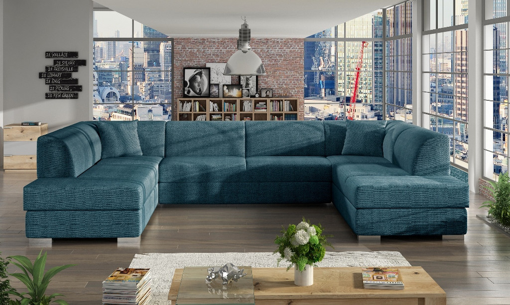Stylová rohová pohovka DARCO do U je rozkládací pohovka, která se skvěle hodí do velkých obývacích pokojů - díky čalouněnému opěradlu ji lze umístit do jejich střední části. Dřevěný rám, který zajišťuje odolnost a stabilitu nábytku, je čalouněný látkou, jejíž povrchovou úpravu si můžete vybrat z barev dostupných ve vzorníku. Sedák je spolu s mírně profilovaným opěradlem vyplněn vlnitou pružinou a čalounickou pěnou T-30, která díky své zvýšené pružnosti zabrání vzniku nevzhledných promáčklin na nábytku. Všestranná rohová pohovka ve tvaru U je víceúčelový kus nábytku, který se vyznačuje moderním provedením zvýrazněným chromovanými nožkami a dekorativními polštáři, které jsou k dispozici jako součást soupravy. Volně stojící nábytek DARCO U je vybaven dvěma úložnými prostory a má také funkci spaní, díky níž lze nábytek bez bočnic rozložit. Model DARCO U se vyrábí také na individuální objednávku, takže je možné zvolit barvu rohových vložek.