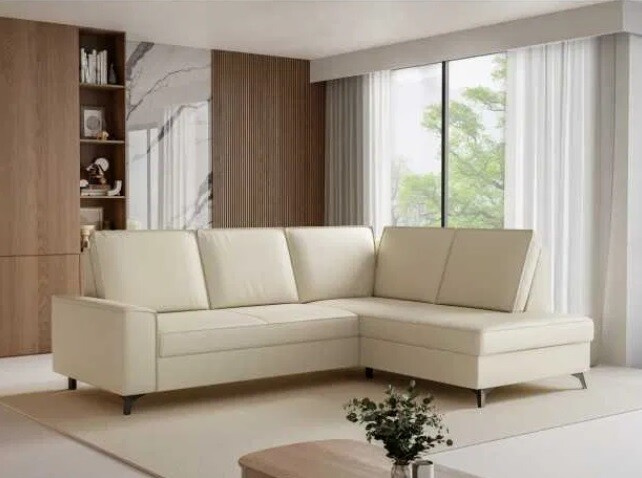 Rohová sedací souprava s funkcí spaní a skříňkou na lůžkoviny, vyrobená z vlnité pružiny. Sedák je vyplněn HR pěnou s vysokou pružností.