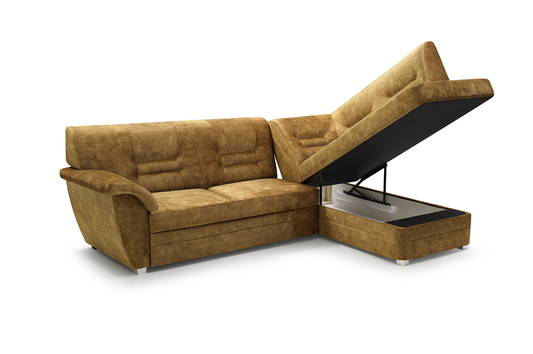 Rohová sedačka JORDANIA pro více osob je rozkládací nábytek určený do obývacího pokoje. Rozměrná rohová sedací souprava ve tvaru písmene L je rozkládací kus nábytku, který lze dokonale přizpůsobit uspořádané místnosti výběrem pravé nebo levé verze. Rohová pohovka s jednou stranou je umístěna na dřevěném rámu, který je zárukou zvýšené odolnosti a stability nábytku. Čalouněná volně stojící rohová pohovka je vyplněna nejen vlnitými pružinami, ale také čalounickou pěnou, která je zodpovědná za zachování odpovídající pružnosti sedáku nebo opěráku. Originálním akcentem modelu JORDANIA jsou chromované nohy. Stylová rohová pohovka má úložný prostor na lůžkoviny a je vybavena funkcí spaní, díky níž lze nábytek bez větších problémů rozložit. Na představené rohové pohovce JORDANIA budete moci nejen odpočívat vsedě, ale také trávit noc s rodinou nebo blízkými přáteli.