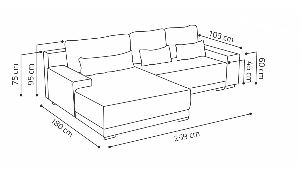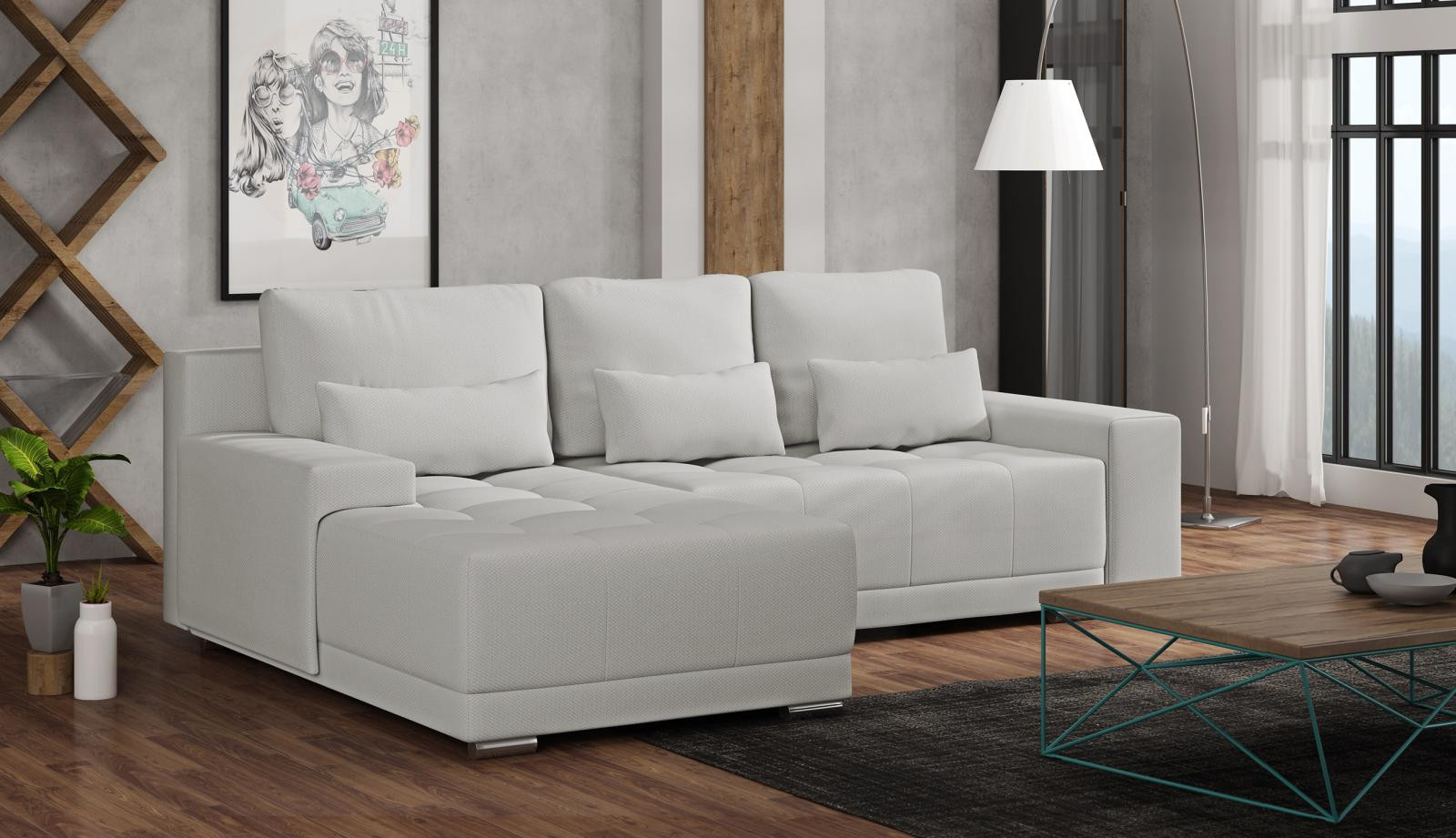 Sedací souprava Lacom výborně zapadne do moderního i klasického interiéru. Její velkou předností je pohodlí, praktičnost a univerzální použití. Tzn. že si ji můžete podle potřeby sestavit jako levou nebo pravou, což je výhoda při zařizování obývacího pokoje. Nemusíte přemýšlet do jakého rohu postavíte sedací soupravu, jednoduše ji podle potřeby přizpůsobíte. Sedací souprava je rozkládací a může tak sloužit k občasnému přespání Vaší návštěvy. Samozřejmostí je i praktický úložný prostor, který můžete využít např. na lůžkoviny. Sedací souprava je potažena kvalitní látkou a nabízíme ji v několika trendy odstínech. Výplň sedáků tvoří kombinace pružin s kvalitní PUR pěnou, což zajišťuje velmi pohodlné sezení. Součástí sedací soupravy jsou tři velké opěrné a tři malé dekorační polštáře. Vyobrazené doplňky a dekorace nejsou v ceně.