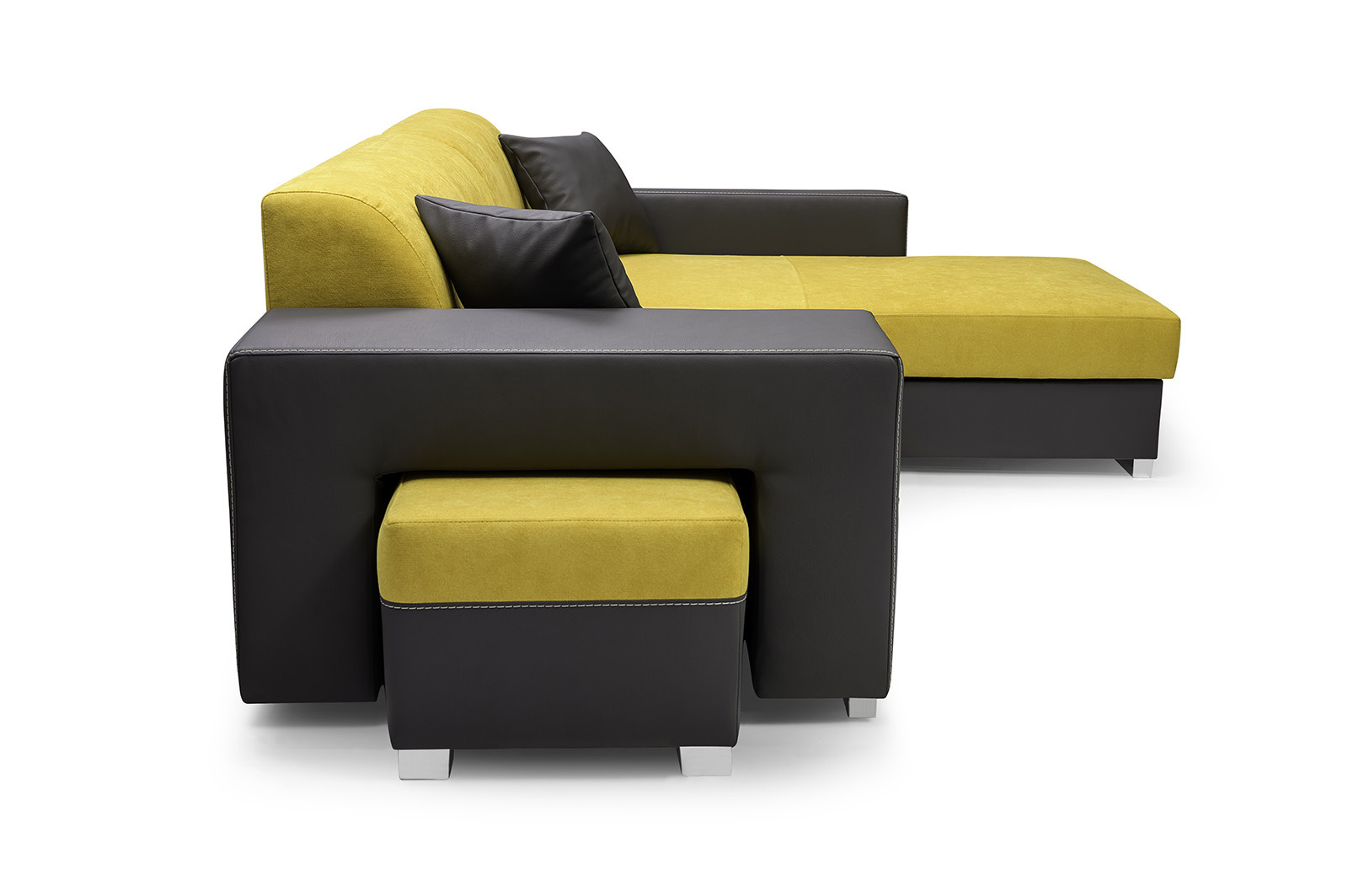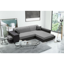 Rozkládací rohová pohovka MADAGASKAR je jednotka s funkcí spaní, praktická pro každodenní použití, která zaujme svým modernistickým designem - nikdo kolem tohoto modelu neprojde lhostejně. Stylová rohová sedací souprava je k dispozici v pravém i levém provedení. Nábytek stojí na chromovaných nohách, které dodávají konstrukci originální nádech. Model MADAGASKAR se dodává s taburetem, pro který je připraven speciální vestavěný úložný prostor. Taburet MADAGASKAR lze použít nejen jako samostatné místo k sezení, ale hodí se i jako podnožka - při sezení a čtení knihy nebo sledování televize si budete moci volně natáhnout nohy. Dodává se také s dekorativními polštářky, díky nimž nábytek získává na lehkosti. Moderní rohová sedací souprava s bočnicemi je v sedací části vyplněna vlnitou pružinou a čalounickou pěnou T-30 - díky těmto materiálům bude rohová sedací souprava kusem nábytku, na kterém se v důsledku každodenního používání neobjeví žádné nevzhledné deformace.