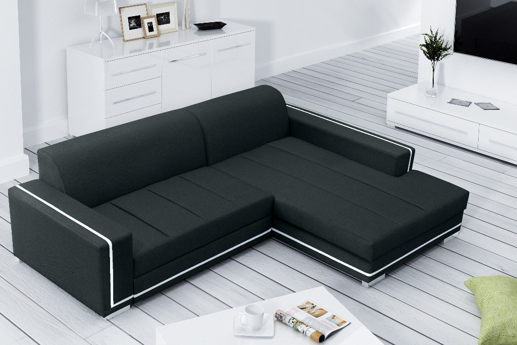 Rozkládací rohová pohovka MARITIN je moderní kus nábytku, který osloví milovníky modernistických řešení, kteří si cení vysoké estetiky a zvýšené funkčnosti. Rohová pohovka na dřevěném rámu a chromovaných nožkách bude vypadat skvěle jak u stěny, tak uprostřed místnosti, protože se jedná o kus nábytku s čalouněnými zády. Rohová sedací souprava MARITIN ve tvaru písmene L je pravostranný nebo levostranný kus nábytku, takže si ji každý může přizpůsobit individuálním preferencím. Moderní rohová sedací souprava je vybavena prostorným kontejnerem na lůžkoviny a funkcí spaní pro pohodlné ubytování hostů. Rohová sedací souprava s bočnicemi je čalouněna látkou, jejíž barvy lze vybrat ze vzorníku barev. Rohová sedací souprava ve tvaru písmene L je potažena čalounickou pěnou a vlnitou pružinou, která zvyšuje její pružnost, takže ani při každodenním používání nedochází k nevzhledným deformacím.
