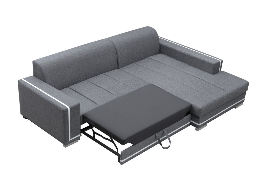 Rozkládací rohová pohovka MARITIN je moderní kus nábytku, který osloví milovníky modernistických řešení, kteří si cení vysoké estetiky a zvýšené funkčnosti. Rohová pohovka na dřevěném rámu a chromovaných nožkách bude vypadat skvěle jak u stěny, tak uprostřed místnosti, protože se jedná o kus nábytku s čalouněnými zády. Rohová sedací souprava MARITIN ve tvaru písmene L je pravostranný nebo levostranný kus nábytku, takže si ji každý může přizpůsobit individuálním preferencím. Moderní rohová sedací souprava je vybavena prostorným kontejnerem na lůžkoviny a funkcí spaní pro pohodlné ubytování hostů. Rohová sedací souprava s bočnicemi je čalouněna látkou, jejíž barvy lze vybrat ze vzorníku barev. Rohová sedací souprava ve tvaru písmene L je potažena čalounickou pěnou a vlnitou pružinou, která zvyšuje její pružnost, takže ani při každodenním používání nedochází k nevzhledným deformacím.