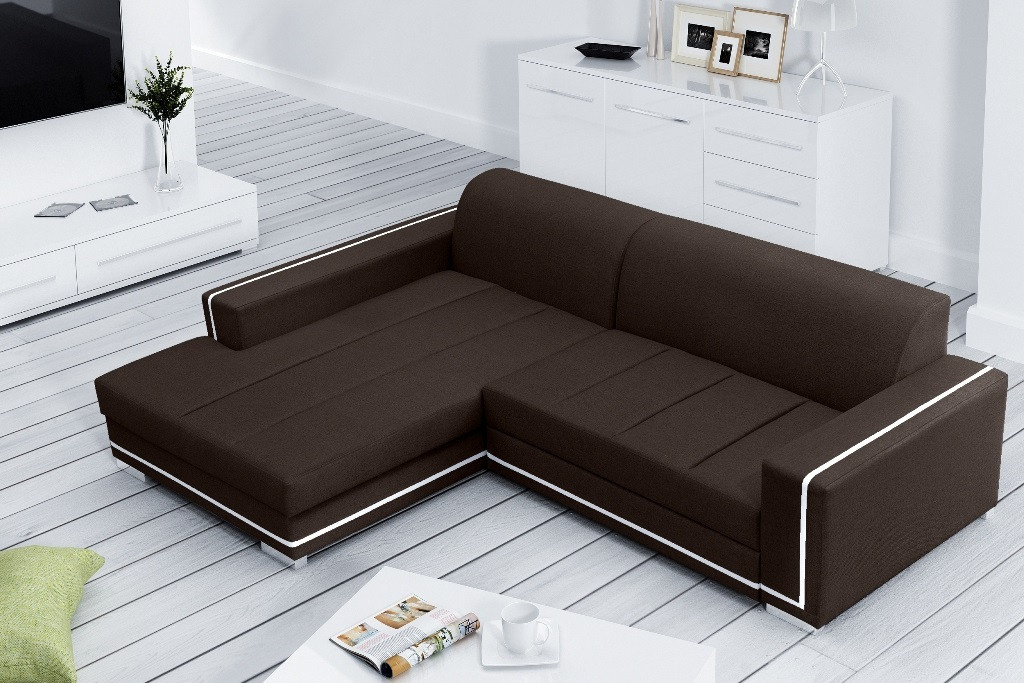 Rozkládací rohová pohovka MARITIN je moderní kus nábytku, který osloví milovníky modernistických řešení, kteří si cení vysoké estetiky a zvýšené funkčnosti. Rohová pohovka na dřevěném rámu a chromovaných nožkách bude vypadat skvěle jak u stěny, tak uprostřed místnosti, protože se jedná o kus nábytku s čalouněnými zády. Rohová sedací souprava MARITIN ve tvaru písmene L je pravostranný nebo levostranný kus nábytku, takže si ji každý může přizpůsobit individuálním preferencím. Moderní rohová sedací souprava je vybavena prostorným kontejnerem na lůžkoviny a funkcí spaní pro pohodlné ubytování hostů. Rohová sedací souprava s bočnicemi je čalouněna látkou, jejíž barvy lze vybrat ze vzorníku barev. Rohová sedací souprava ve tvaru písmene L je potažena čalounickou pěnou a vlnitou pružinou, která zvyšuje její pružnost, takže ani při každodenním používání nedochází k nevzhledným deformacím.
